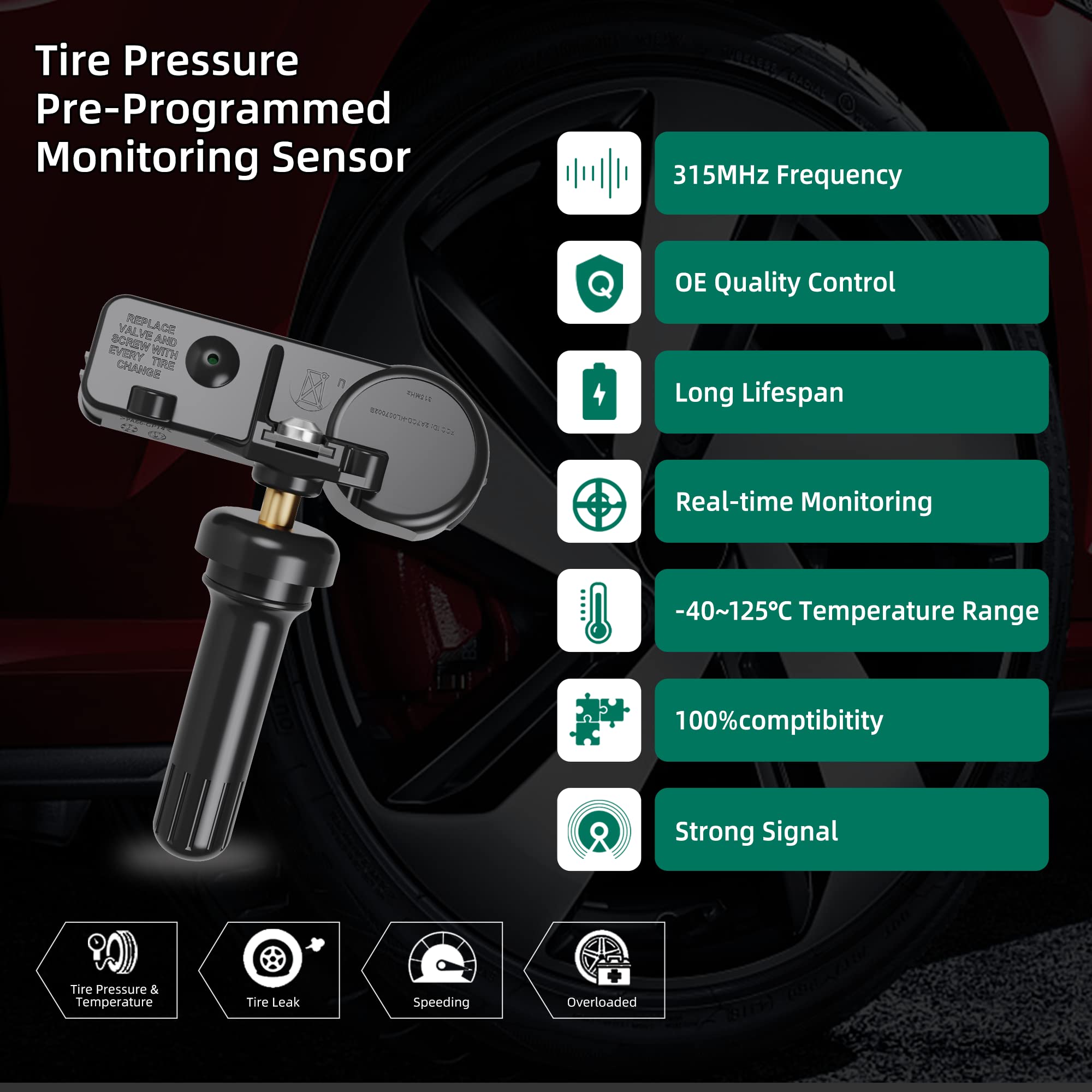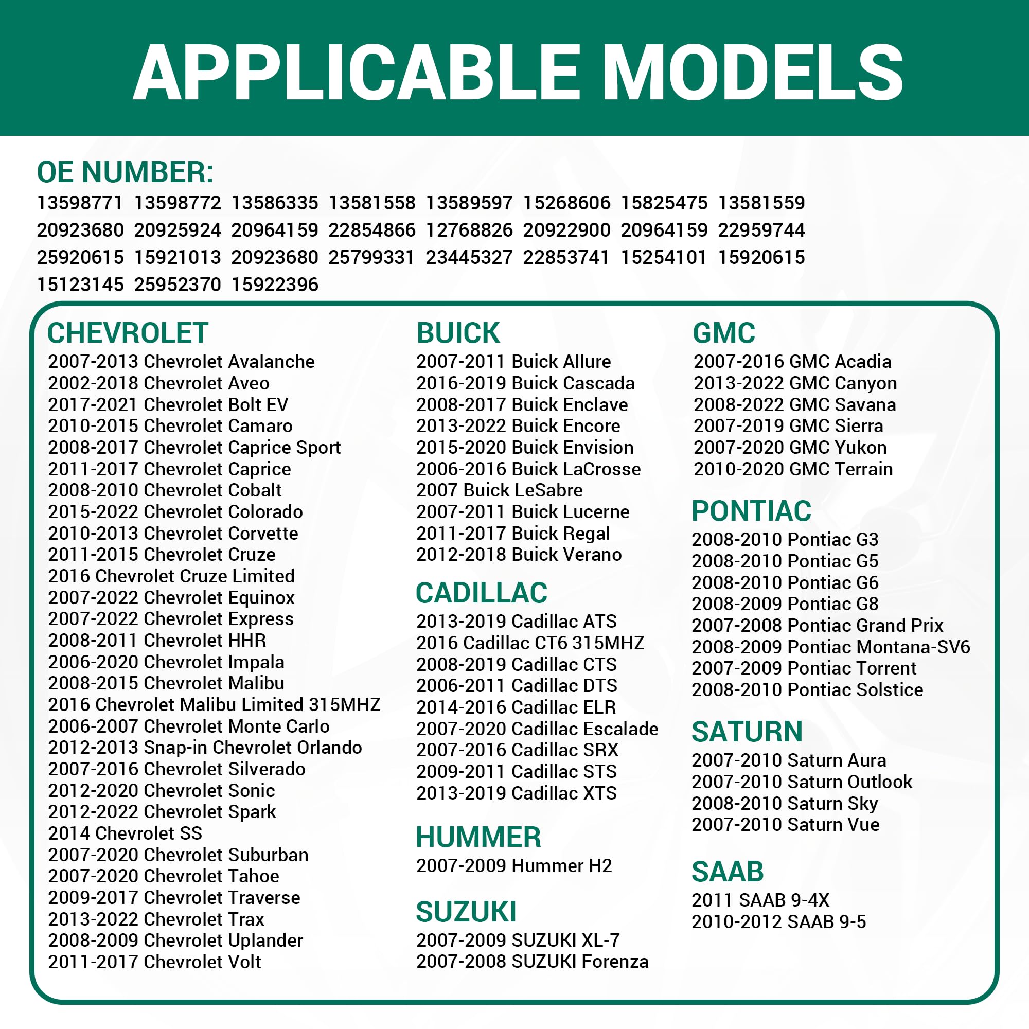 PREFECT REPLACEMENT:The tire pressure monitor system (TPMS) is 100% Brand new Compatible with most GM branded vehicles manufactured after 2006.including GMC Chevy Buick Cadillac