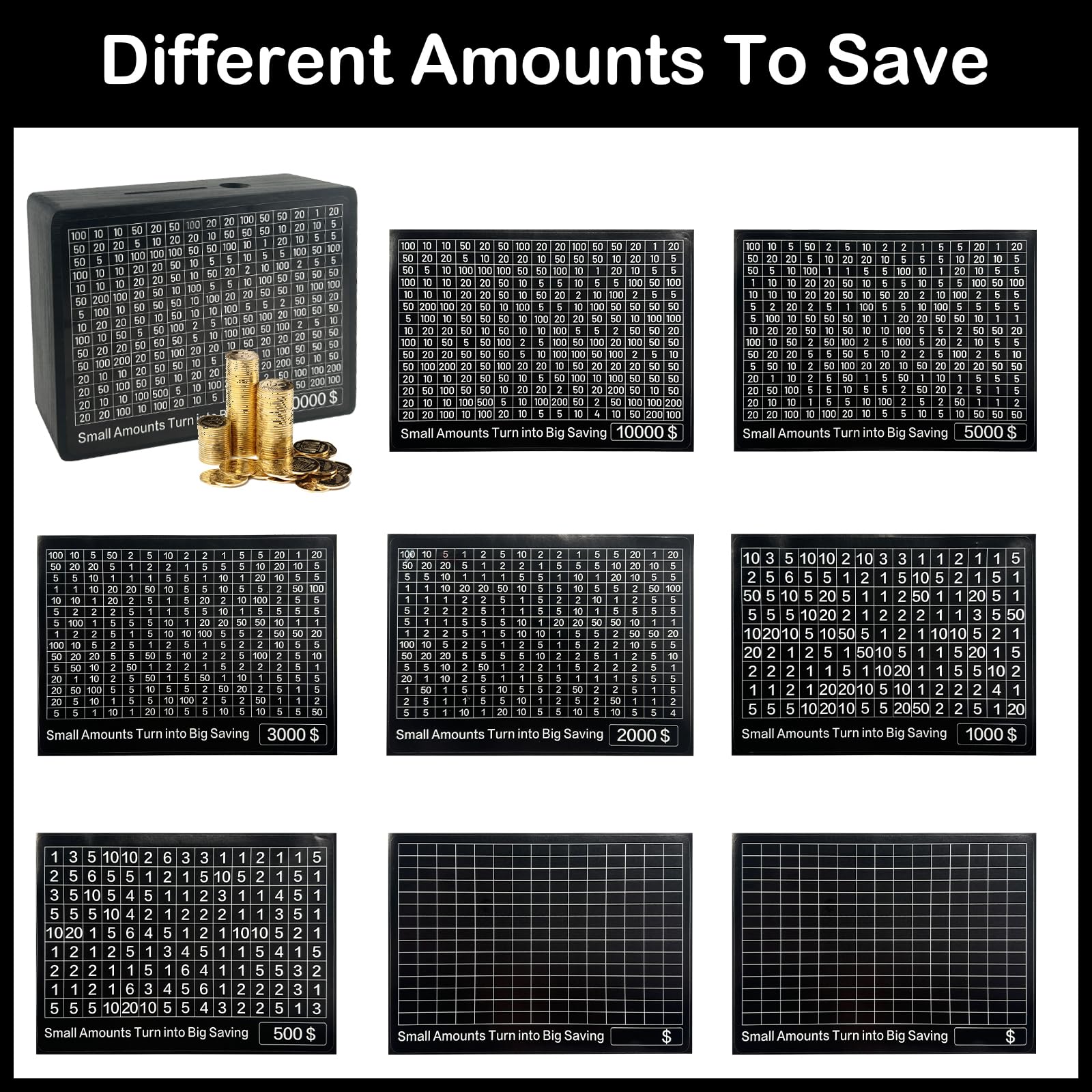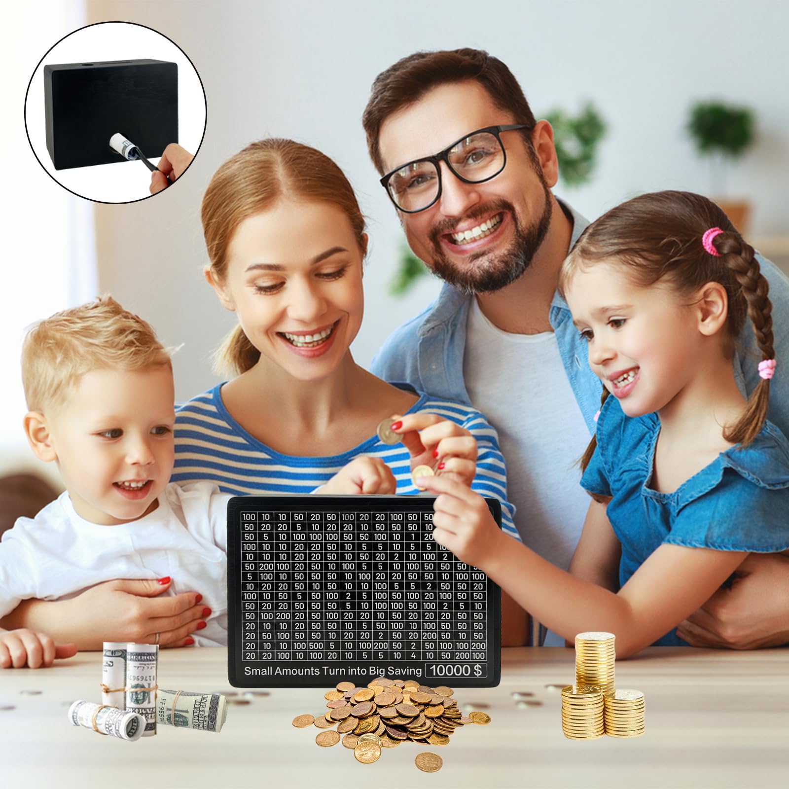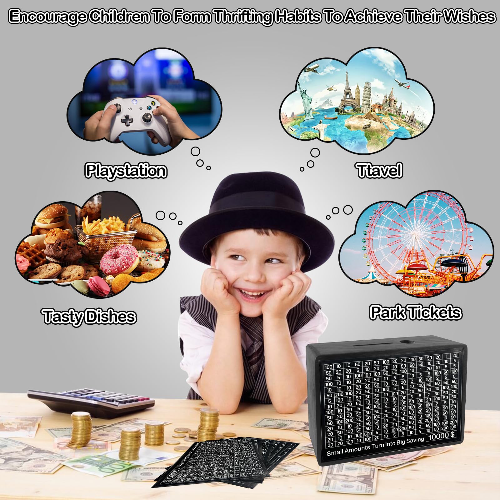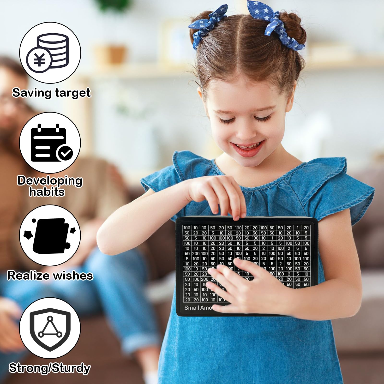 【Money Box with Counter】our Retro Money Bank offers 8 savings goals to choose from,including options such as 10000, 5000, 3000, 2000,1000 and 500 dollars.and there are two customizable cards provided where you can mark your desired savings amount for a personalized financial goal.Paste what you want to store amount,allowing you to track and mark the money you save each time.With a maximum capacity of 10,000.When you mark all the numbers, you have completed the challenge and achieved the goal.