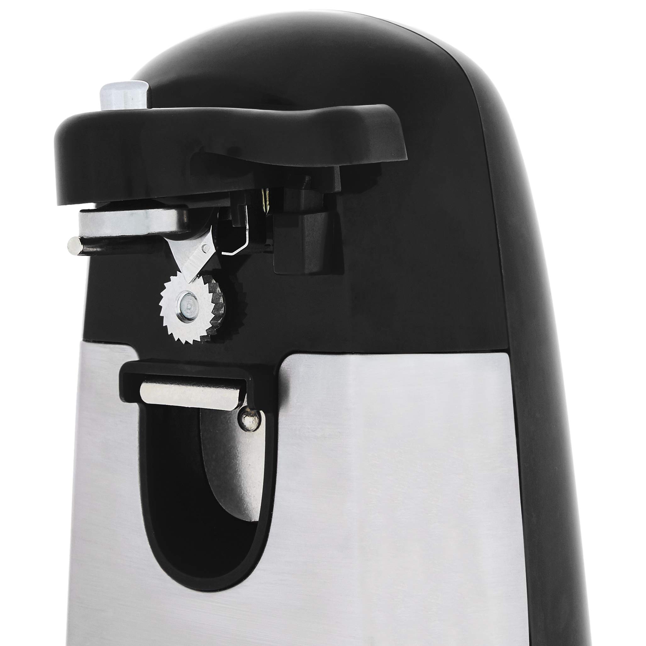 Product Description This can opener electric features include a powerful stainless steel blade that glides through lids smoothly. Its wide, non-slip base provides stability on your countertop, making it one of the best can openers among households. From the Manufacturer Amazon Basics
