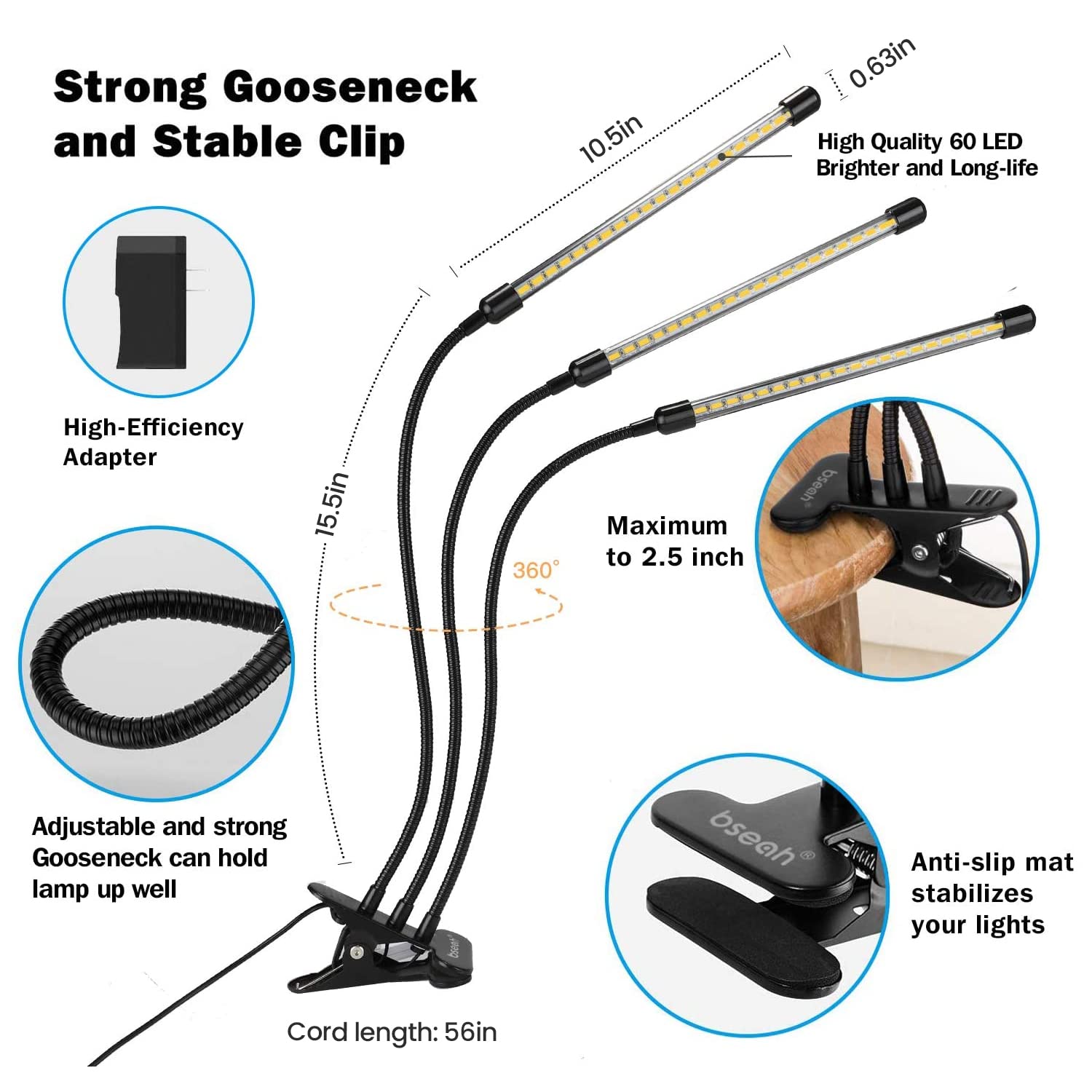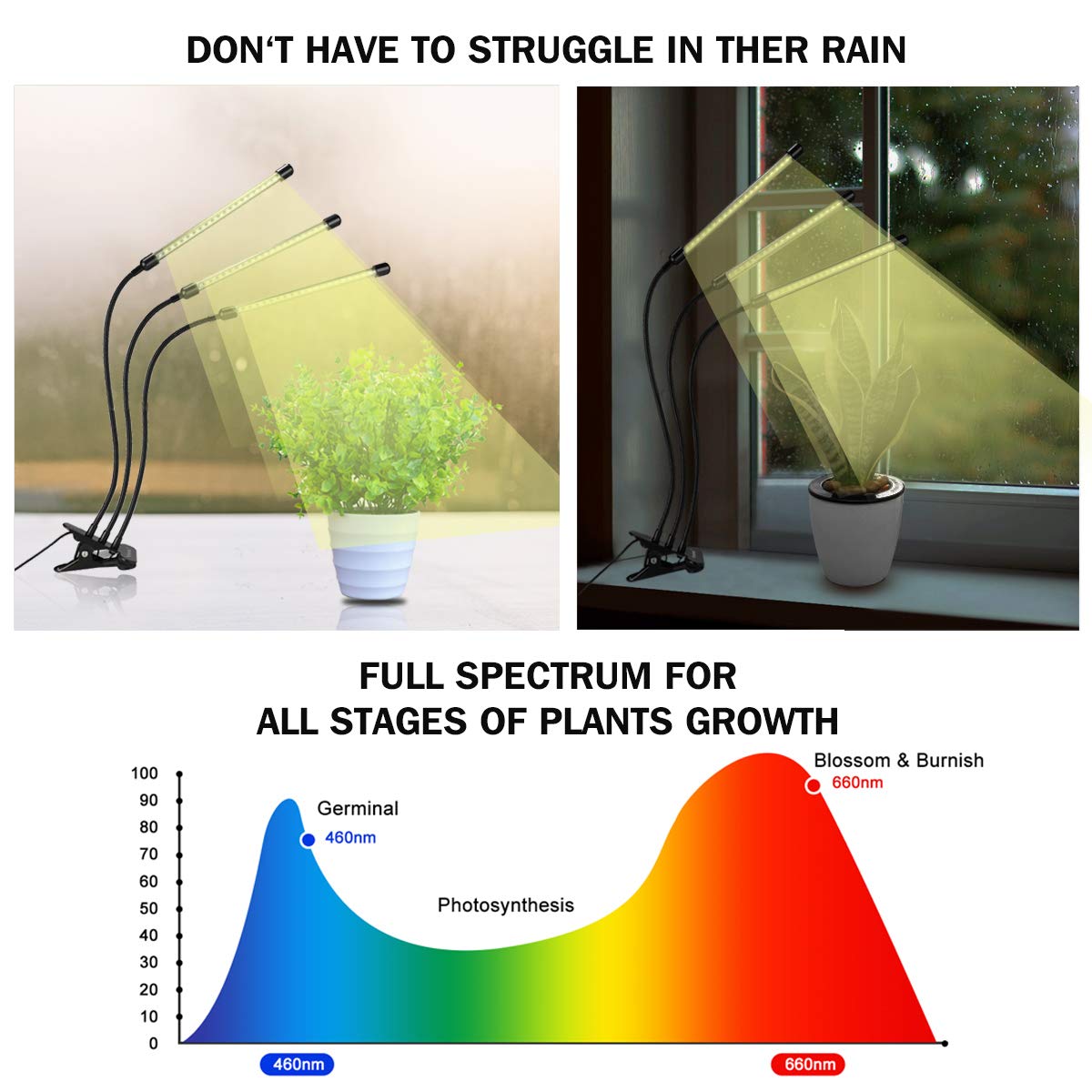 Strong and Stable: The metal gooseneck is strong enough, with a non-slip mat design, which can fix the lamp well and make the grow light stand.