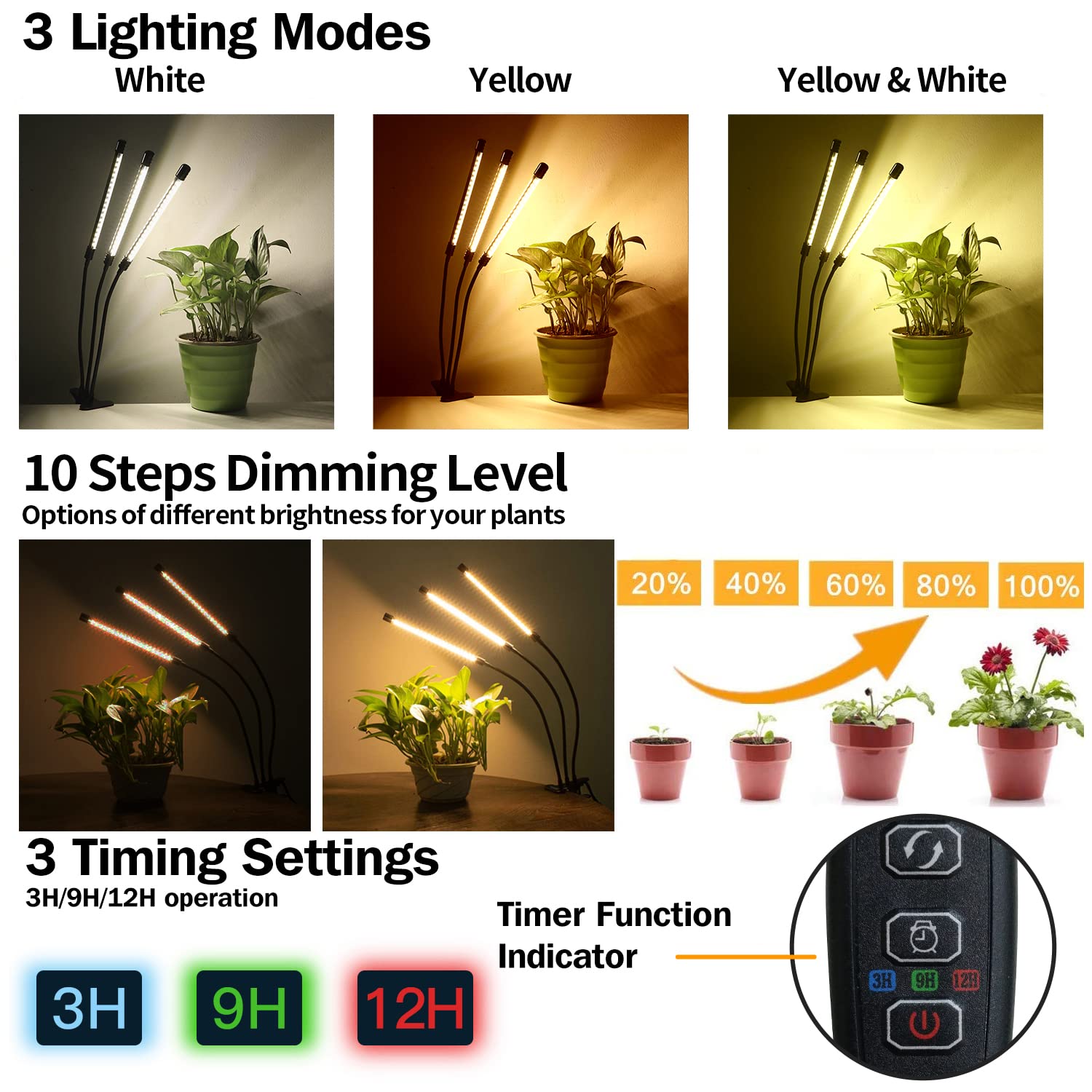 Full Spectrum LEDs with Yellow and White Combination: 3 timing options and 10 dimmable lightness Meet the needs of photosynthesis in different stages of plants.