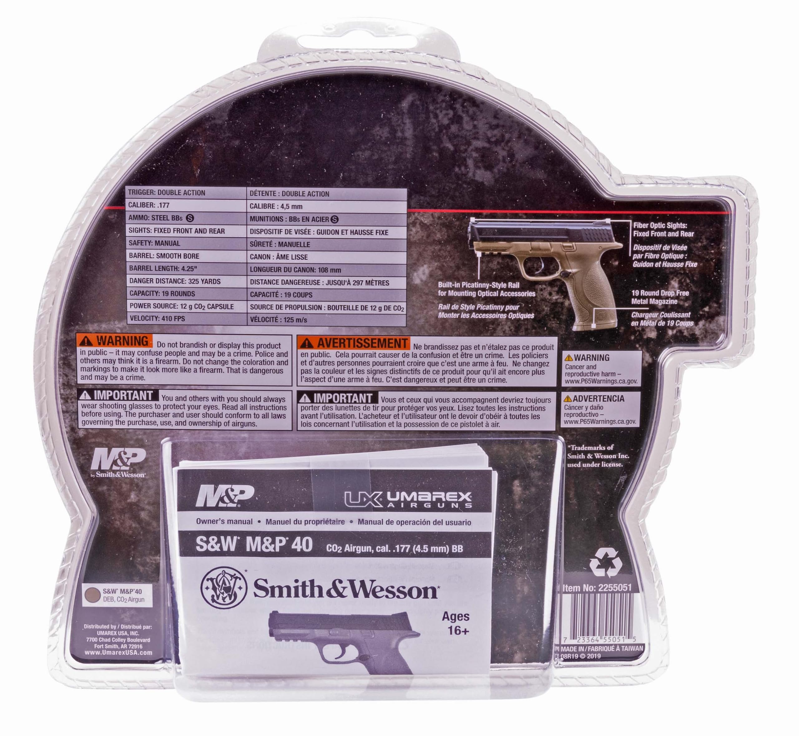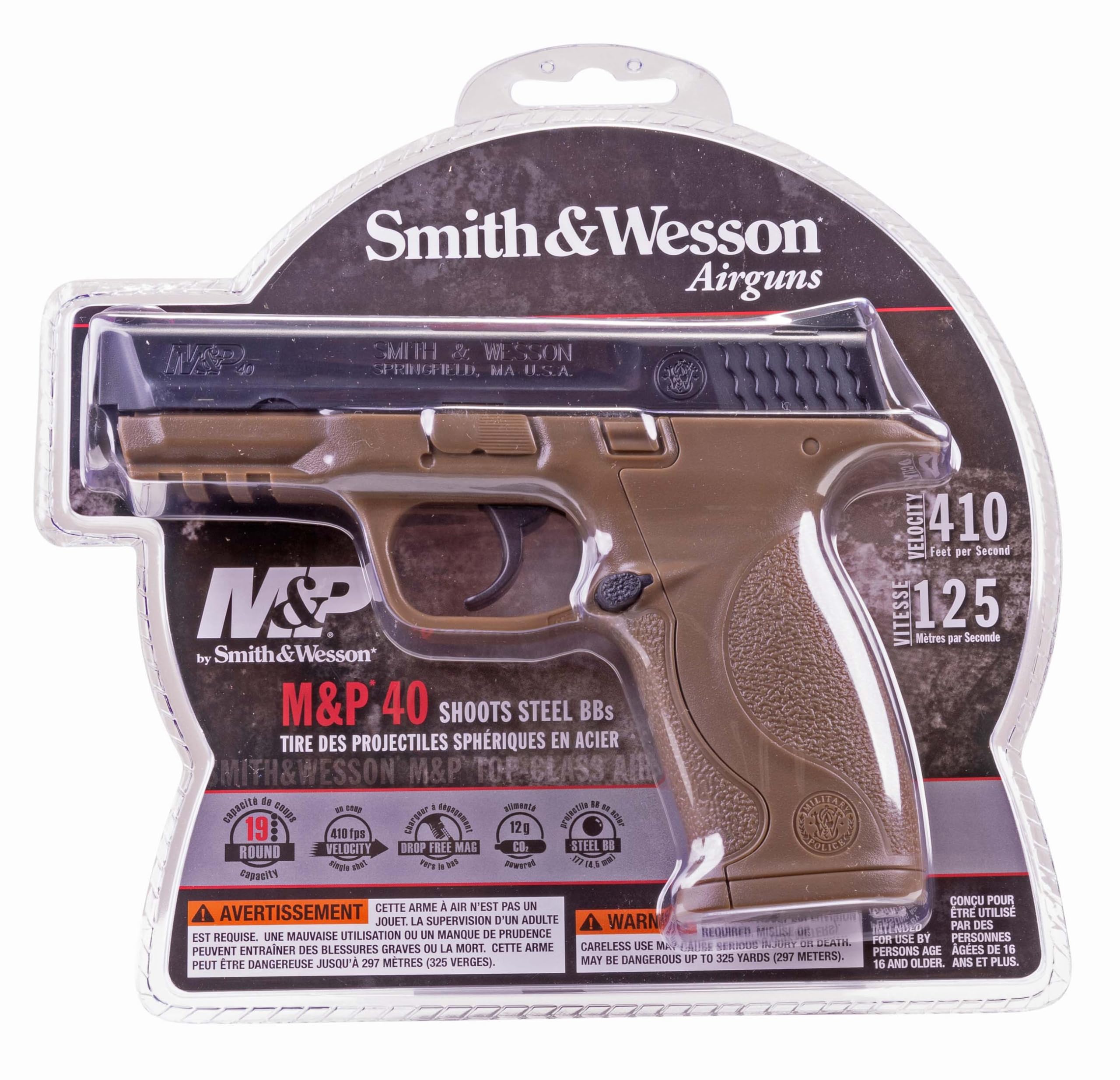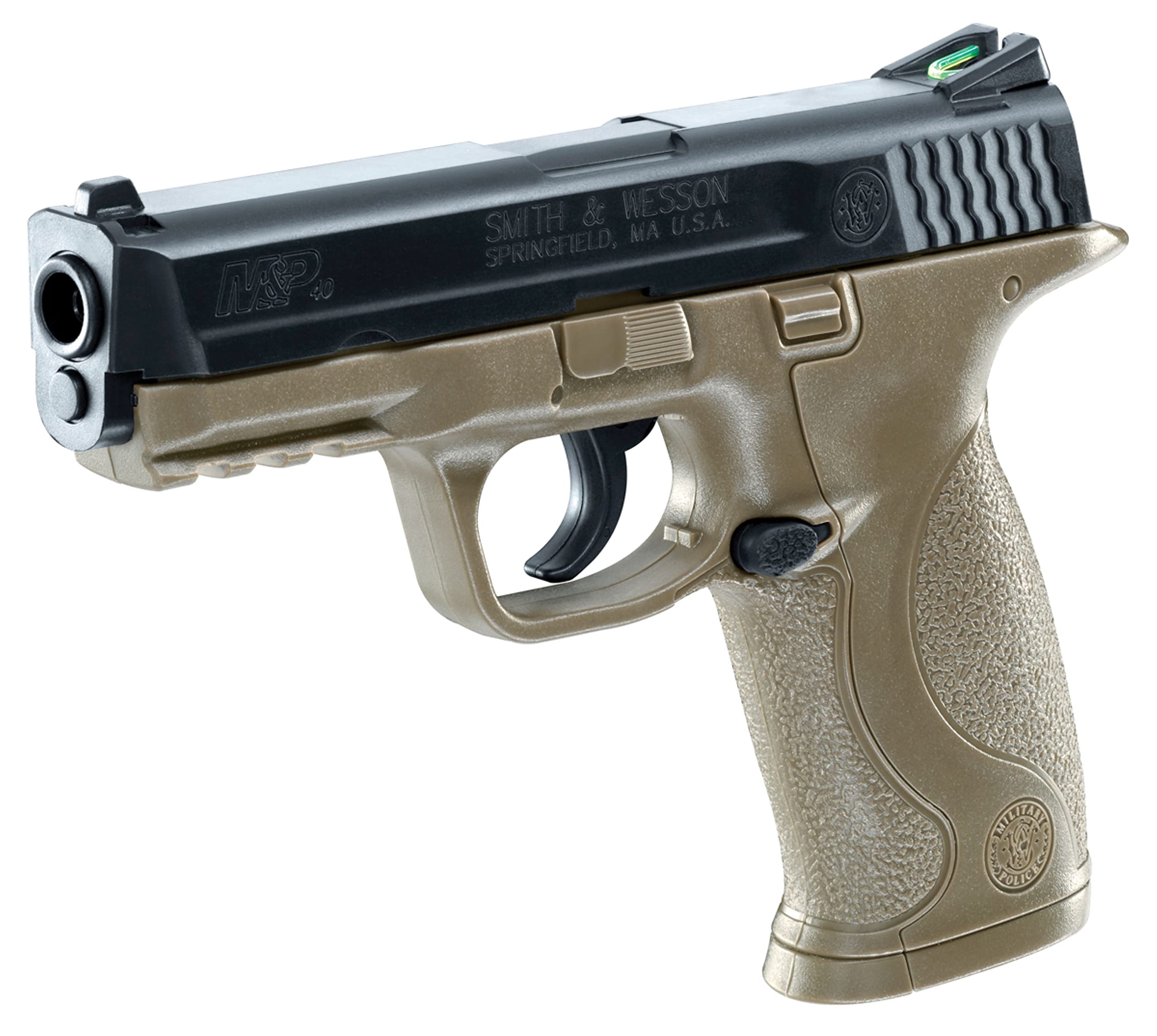 The Smith & Wesson M&P is a favorite of law enforcemen. The M&P air pistol is a BB repeater powered by one 12g CO2 cylinder in the grip. An integrated accessory rail makes adding a tactical light or laser easy. The 19-shot mag drops free. The M&P has a manual safety, double action trigger, and fiber optic sights. This BB replica is not only a great BB gun for plinking, but it makes a great target shooting and training pistol for S&W M&P owners.
