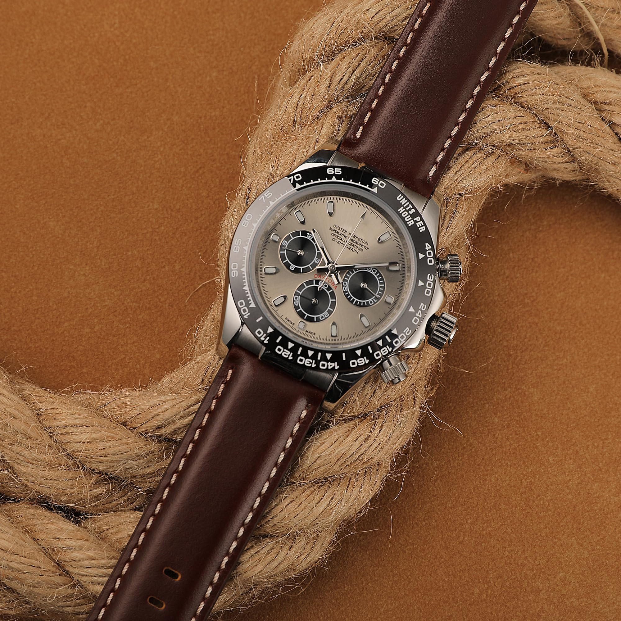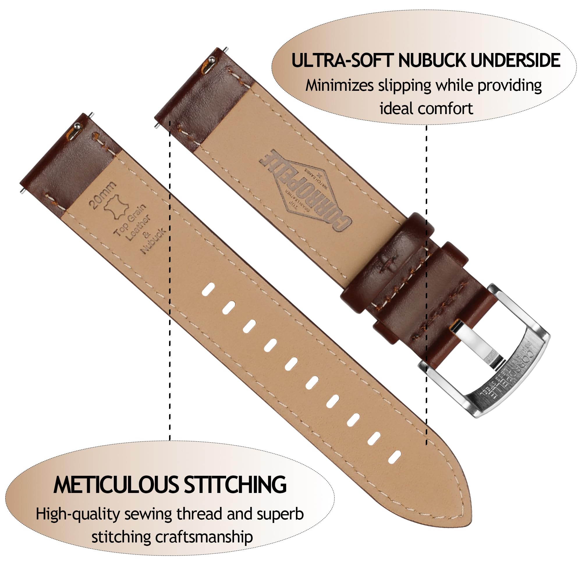 ELEGANT CLASSIC STYLE, Top Grain Leather & Nubuck: Hand-selected top-grain genuine leather is used for the top layer of the CORROPELLE quality watch band, presenting a luxury look with a light waxy feel. A natural patina may develop over time, giving this watch band a worn-in, timeless feel. These simple imperfections will add a rich texture to any timepiece. Treated underside beige nubuck lining ultra-soft against the skin and minimizes slipping while providing ideal comfort.