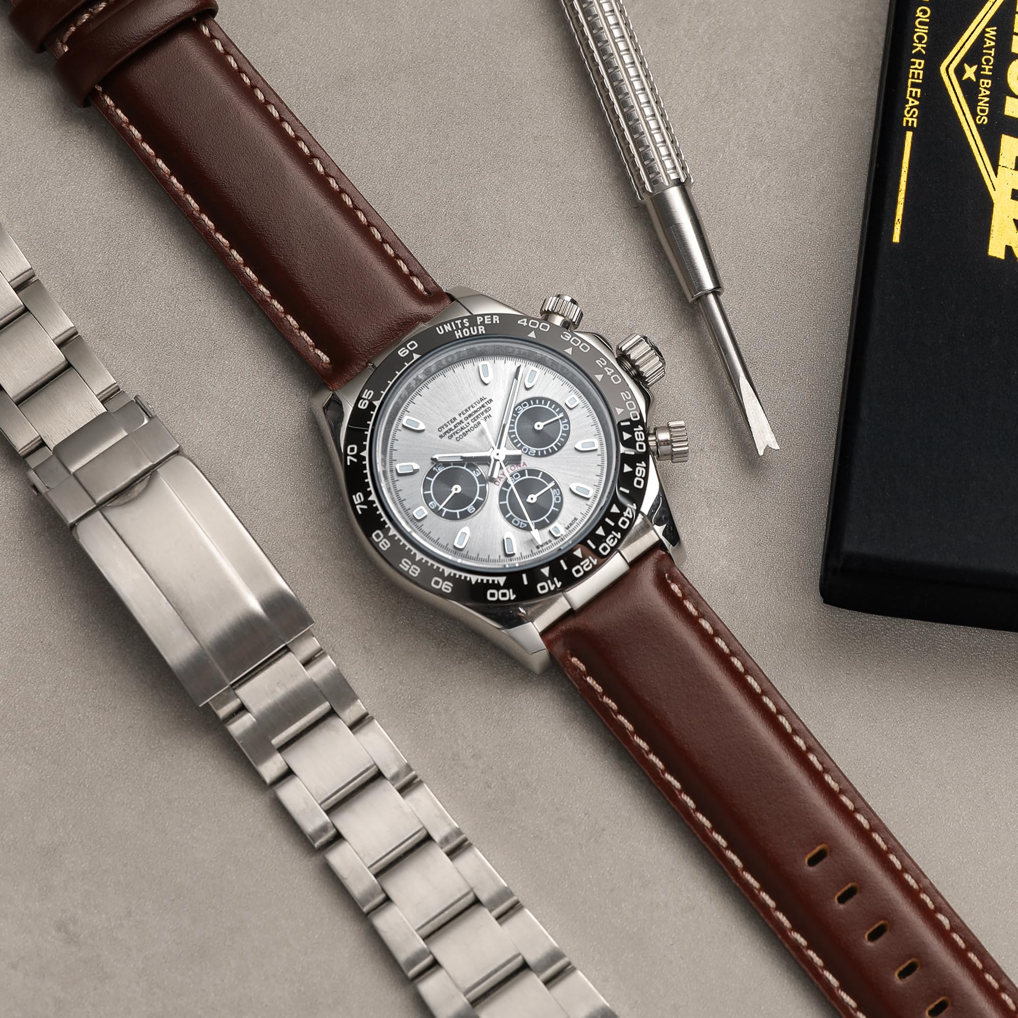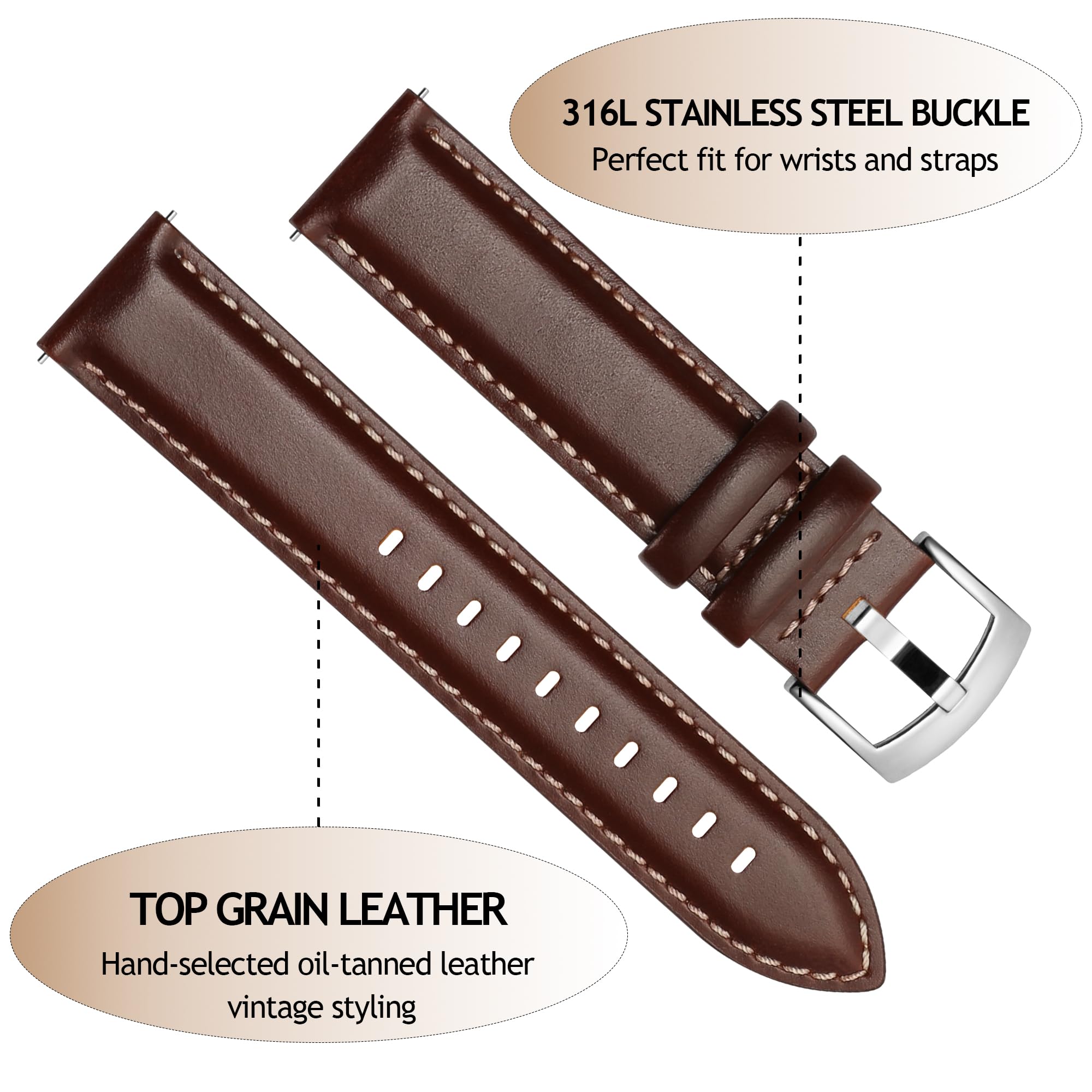 SWAP IN SECONDS, Solid Quick Release Spring bars: The high-quality quick-release spring bars are included with and integrated into the watch strap. "Quick Release" is more secure and convenient connection for your watch and smartwatch, which lock onto the watch precisely, easy to install and remove. Swap daily to compliment your wardrobe, Simply slide quick release knob with finger. No tools are required.