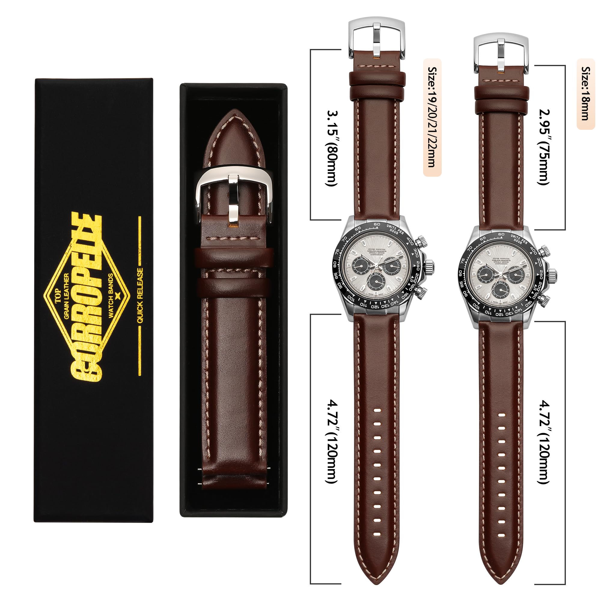 HIGH QUALITY BUCKLE, Luxurious 316L Stainless Steel & Classic Design: High-quality 316L stainless steel jewelry grade buckles assembled in our watch straps, which work great, are reliable and durable. The classic buckle is designed appropriately curved to be a perfect fit for the wrist and straps, the comfortable fit that keeps you coming back to CORROPELLE prevails. It features polished finish and brushed underside etcheded brand's mark to provide a simple, sharp, and classic look.