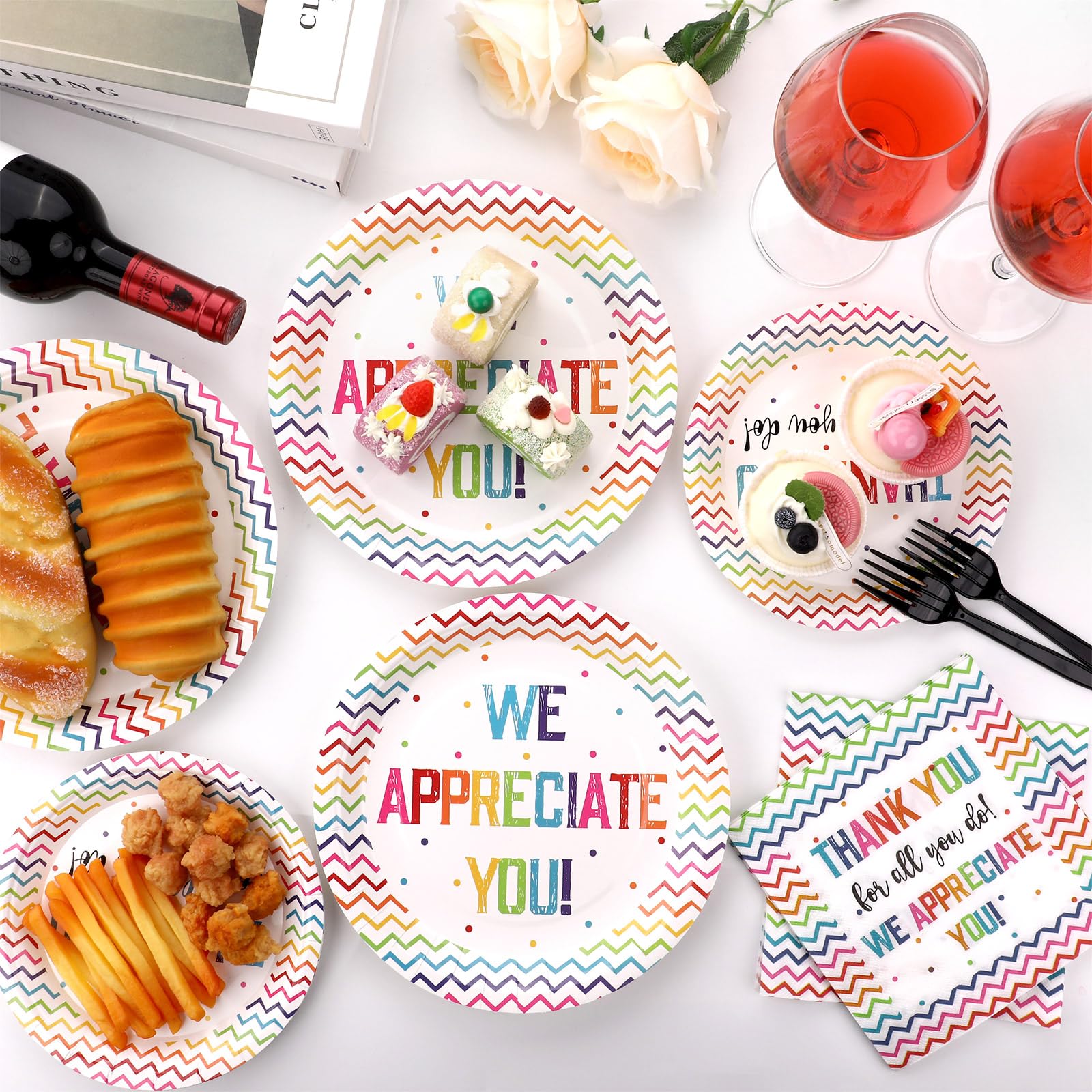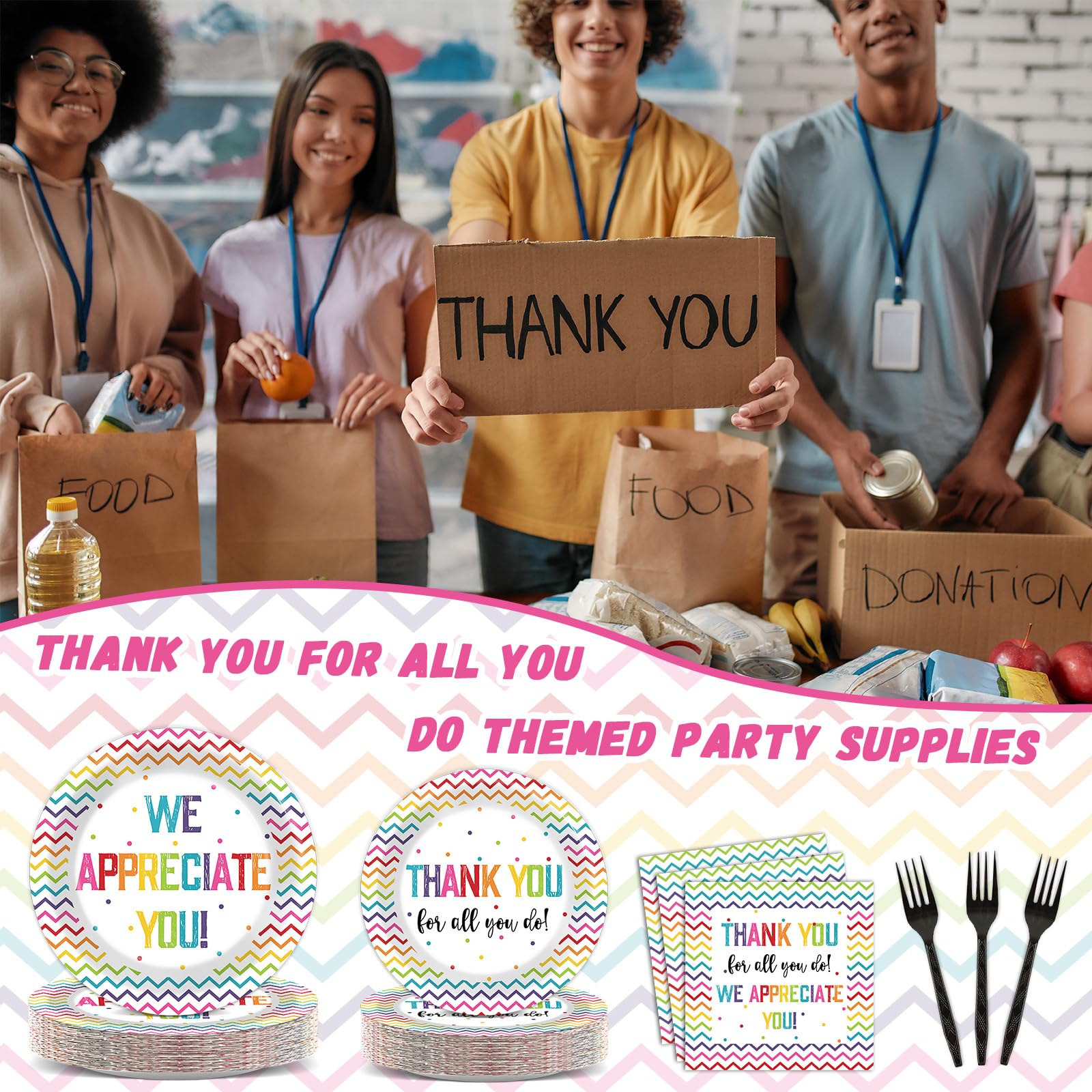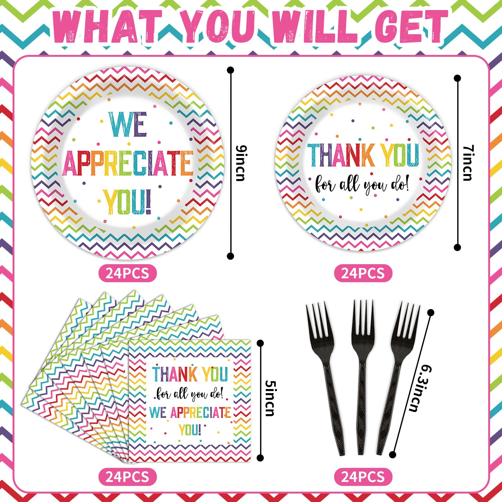 We Appreciate You Thanksgiving Themed Plates:Includes 24 9-inch plates, 24 7-inch paper plates, 24 5-inch lunch napkin and 24 pink forks, there are a total of 96 pieces in this set, good for appreciation parties and more.
