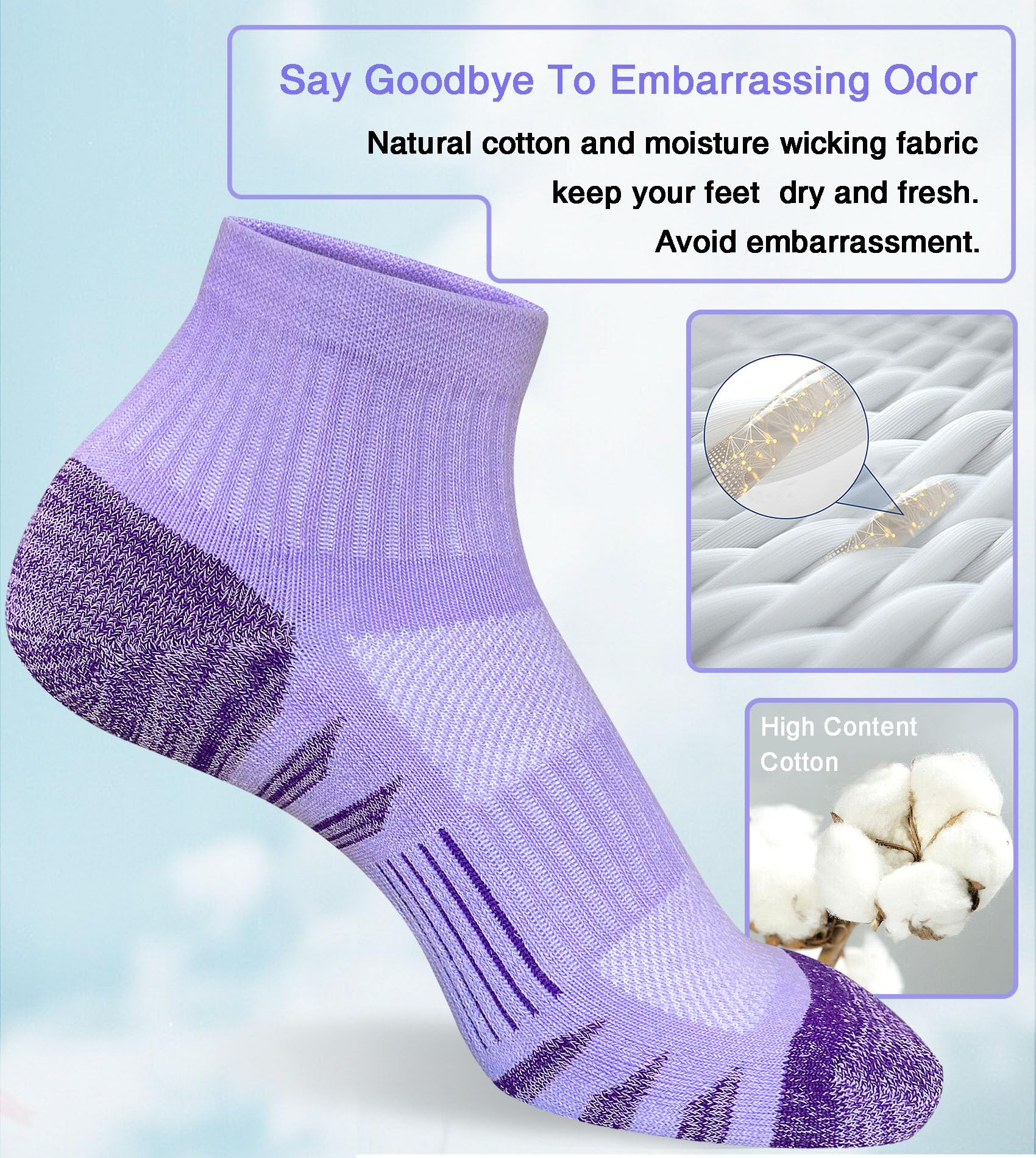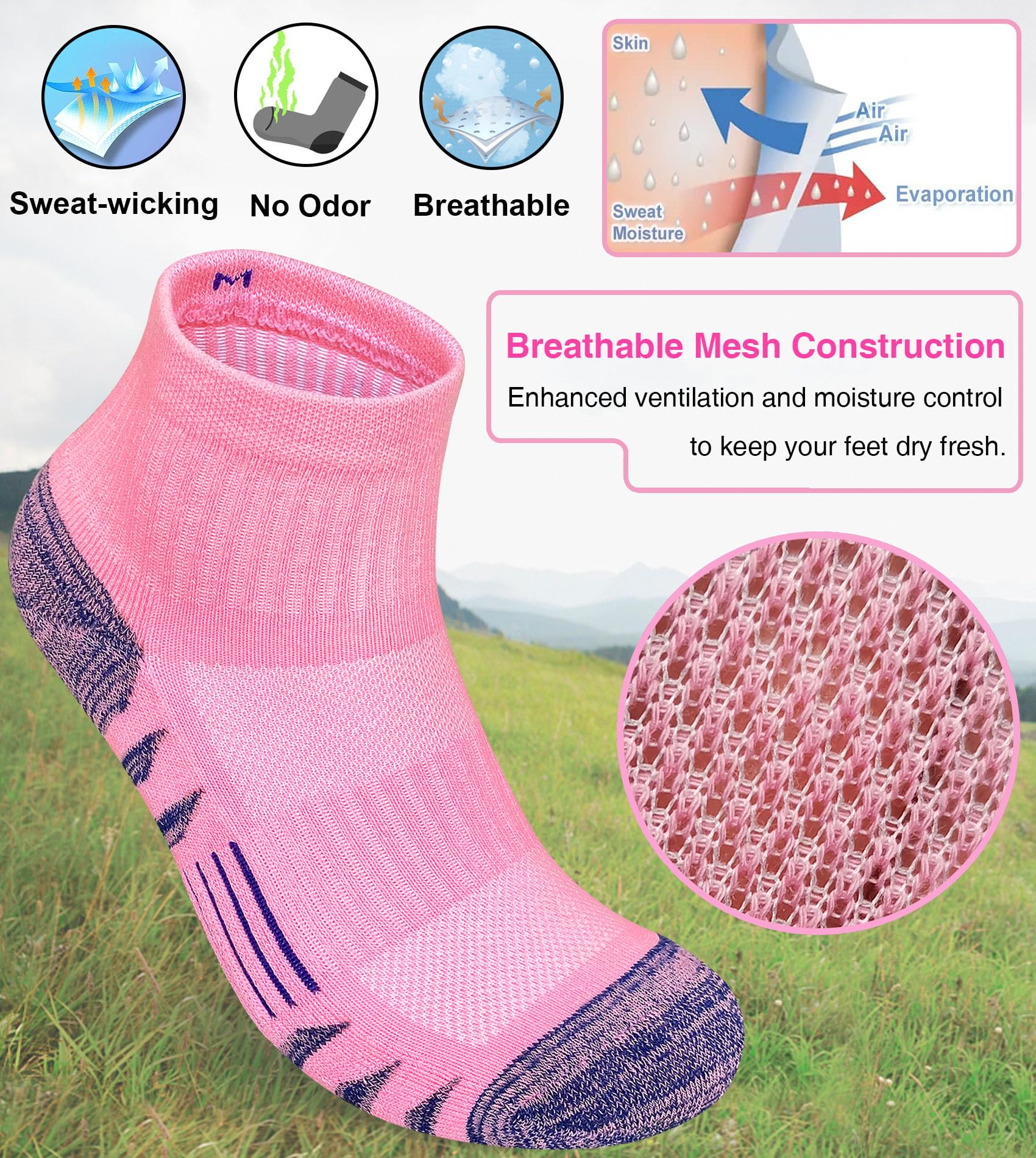 【Moisture Wicking and Anti-odor】Made of high quality combed cotton and moisture control fibers for extra softness and comfort while retaining sweat-wicking properties. Breathable mesh helps to ventilate release the heat, keep feet dry and fresh whole day