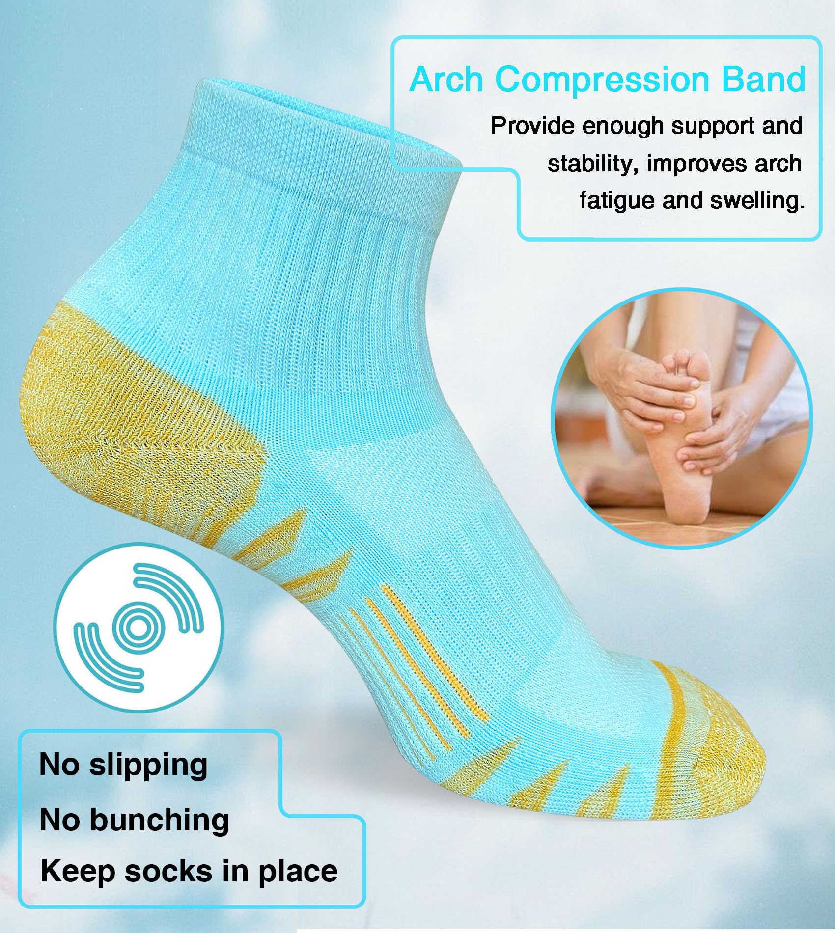 【Fit for Running】Our Ladies socks have a compression band in arch can hugs your foot evenly, provide support and stability. The right of compression power can help relieve foot fatigue and swelling. Good matching for all of your outdoor activities