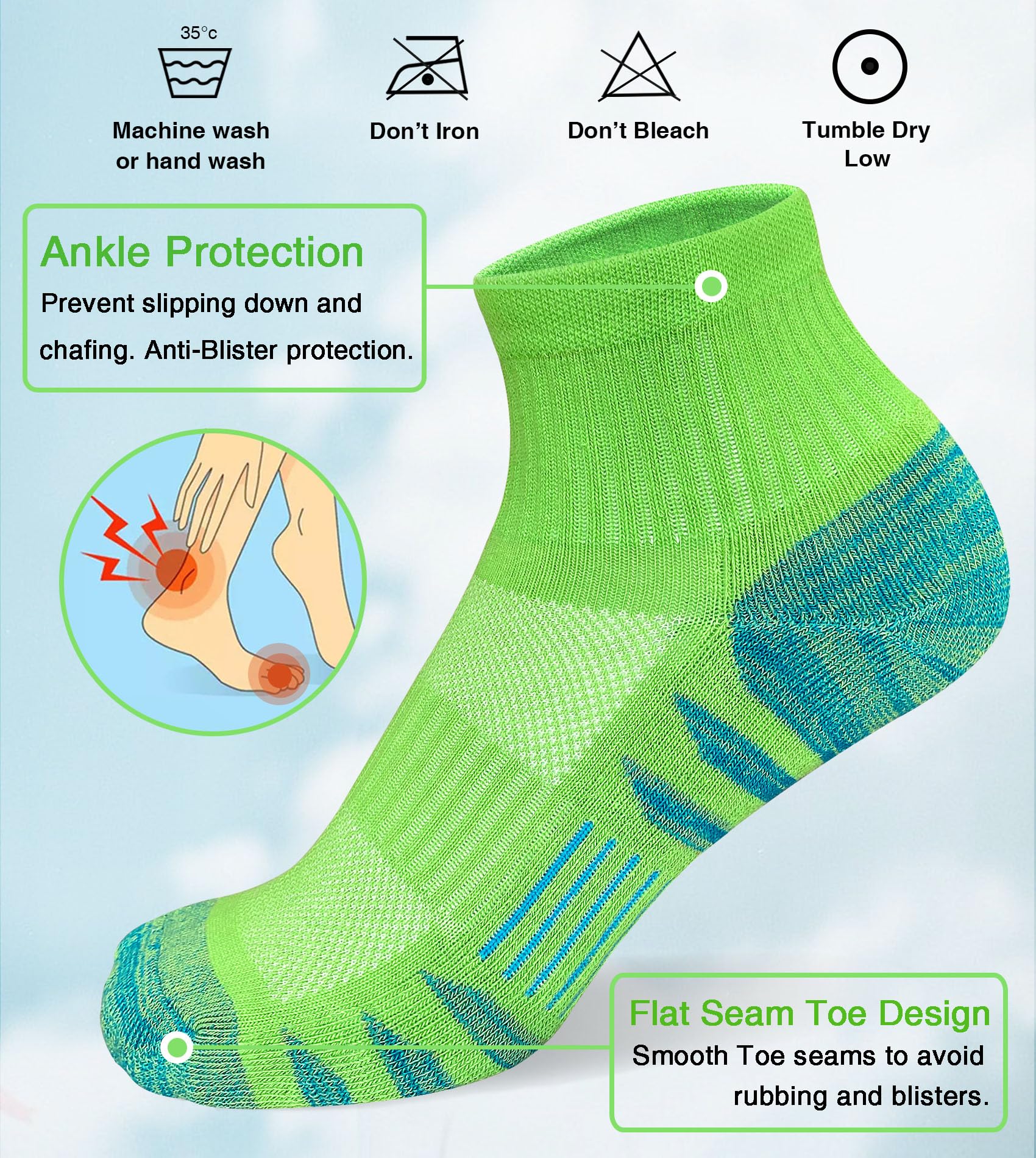 Description Womens Performance Athletic Running Hiking Socks Anti-Blister Protection Heel Tab: prevent slipping down and chafing. Moisture Wicking: Absorb sweat to keep your feet dry. Cushioned Sole: Absorb impact and reduce friction. Breathable Mesh: Help keep your feet dry and cool. Arch Support: Provide enough support and stability. Package: 5 Pairs of socks per pack. Washing Suggestion: Machine wash or hand wash. Water temperature should not exceed 40°C or 105F. Do not bleach, iron or dry clean, tumble dry low & Air Dry .