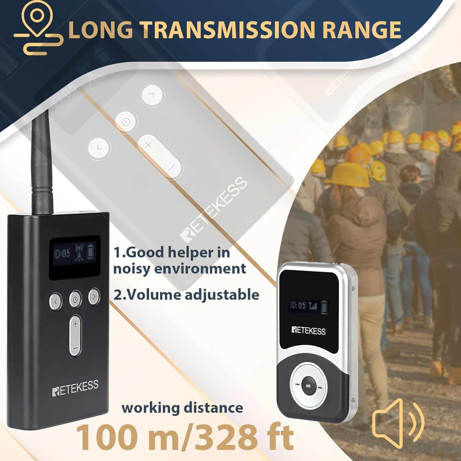 Wider coverage capacity; tour guide audio system supports unlimited multiple receivers across 328ft/100m, ideal for school campus tours (outdoor education) or travel groups; no signal loss during movement