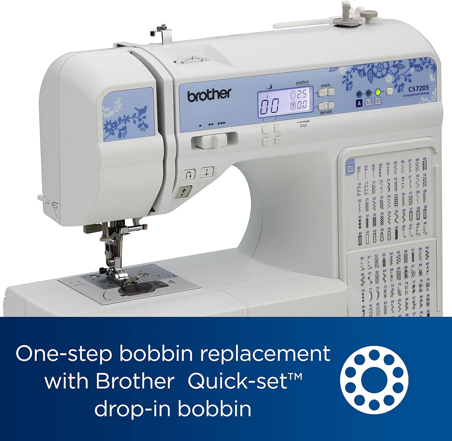 Make your sewing and quilting dreams a reality with the CS7205 computerized sewing machine from Brother! This machine allows you to view all the built-in stitches at a glance with the convenient flip chart. Choose from 150 decorative, quilting and utility stitches, plus a sewing lettering font with 55 alphanumeric stitches for basic monogramming. Also featured are large back-lit LCD display for easy viewing, even in low light, variable speed control, brightly lit workspace, drop feed dogs, automatic needle threader and much more! Packed with included accessories this machine is a great value with 11 included sewing/quilting feet and wide table.