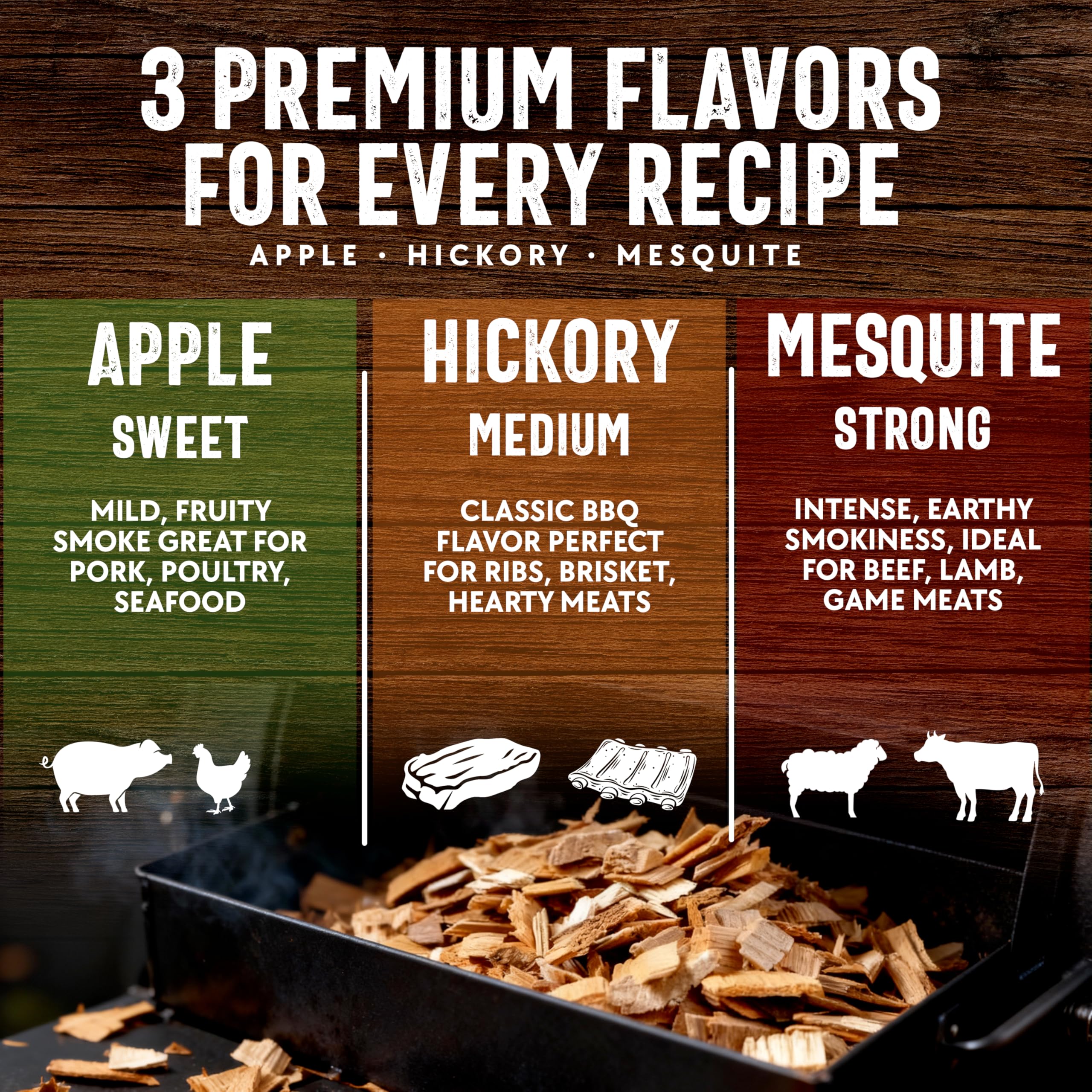 3 BOLD FLAVORS FOR THE ULTIMATE BBQ EXPERIENCE – Elevate your grilling game with our Premium Smoking Chips Variety Pack, featuring three distinct hardwood flavors to suit every recipe. Enjoy the subtly sweet and fruity smoke of Applewood for pork, poultry, and seafood; the deep, classic smokiness of Hickory for ribs, brisket, and hearty cuts; and the bold, earthy intensity of Mesquite for beef, lamb, and wild game. Perfect for use in charcoal grills, gas grills, and electric smokers, this versatile trio delivers rich, authentic BBQ flavor for every cookout.