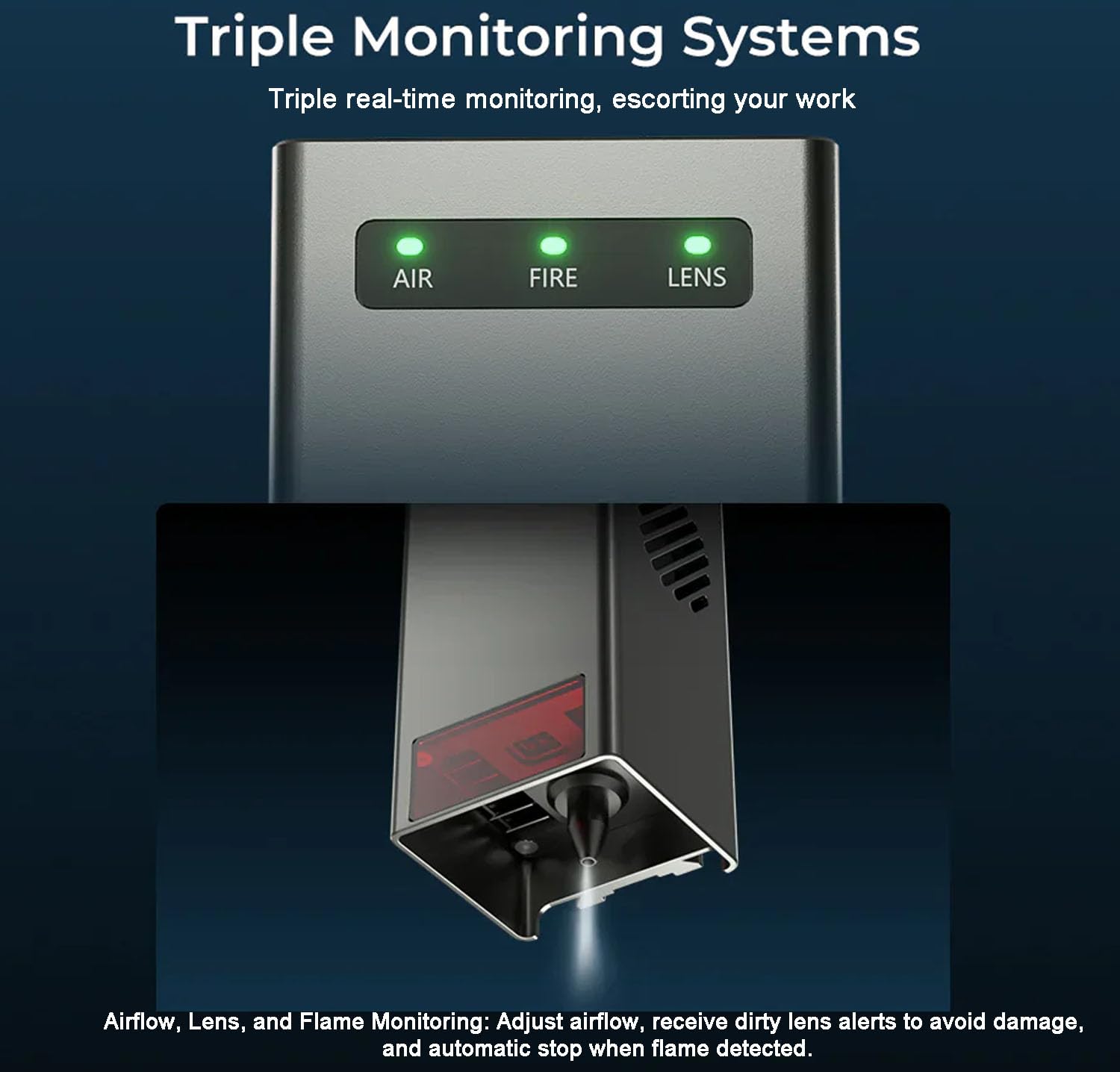 【Integrated Air Assist】Equipped with an air assist set on the laser engraver keep your arts with smooth lines,complete patterns and clean material surfaces, by quickly reduce the temperature of the material surface, preventing distortion and discoloration due to high temperatures, effectively blows away smoke and debris generated during laser engraving machine working ensures laser energy stability.