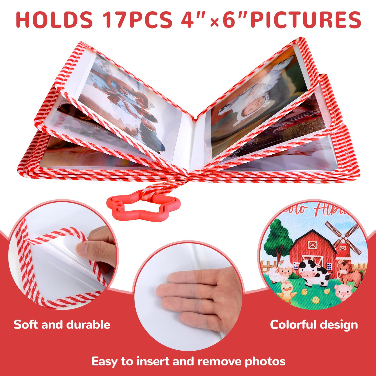 Super value pack: This farm animals first family photo album is designed to hold up to 17 sheets of 4x6 inch photos, making it the ideal baby photo album to capture your little one’s milestones. With secure hooks for hanging and a small mirror on the back, it's a delightful addition to your baby scrapbook collection.