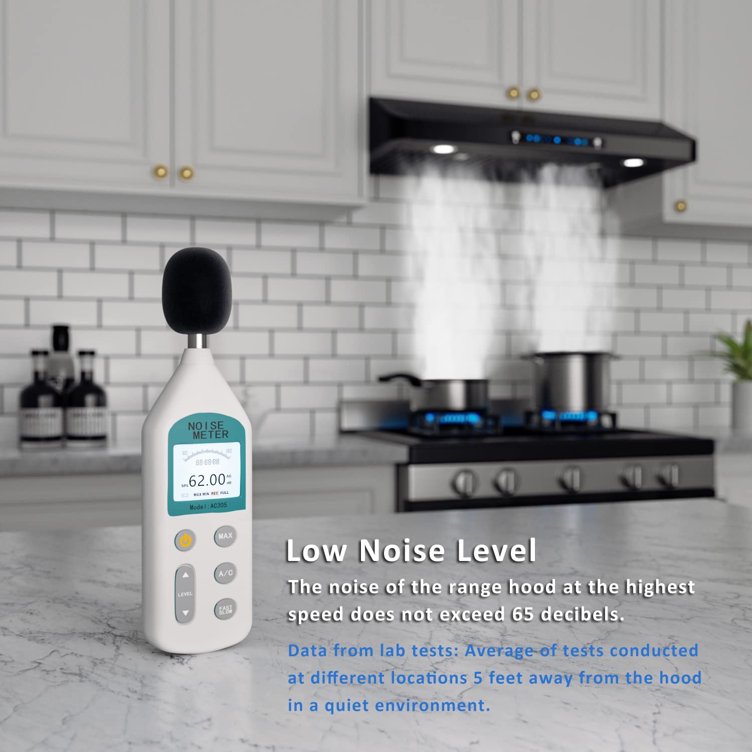 Ultra-quiet operation keeps noise level less than 65DB at high speed. The high-performance 4-speed motor effortlessly and quietly ventilates your kitchen to remove cooking odors and smoke.