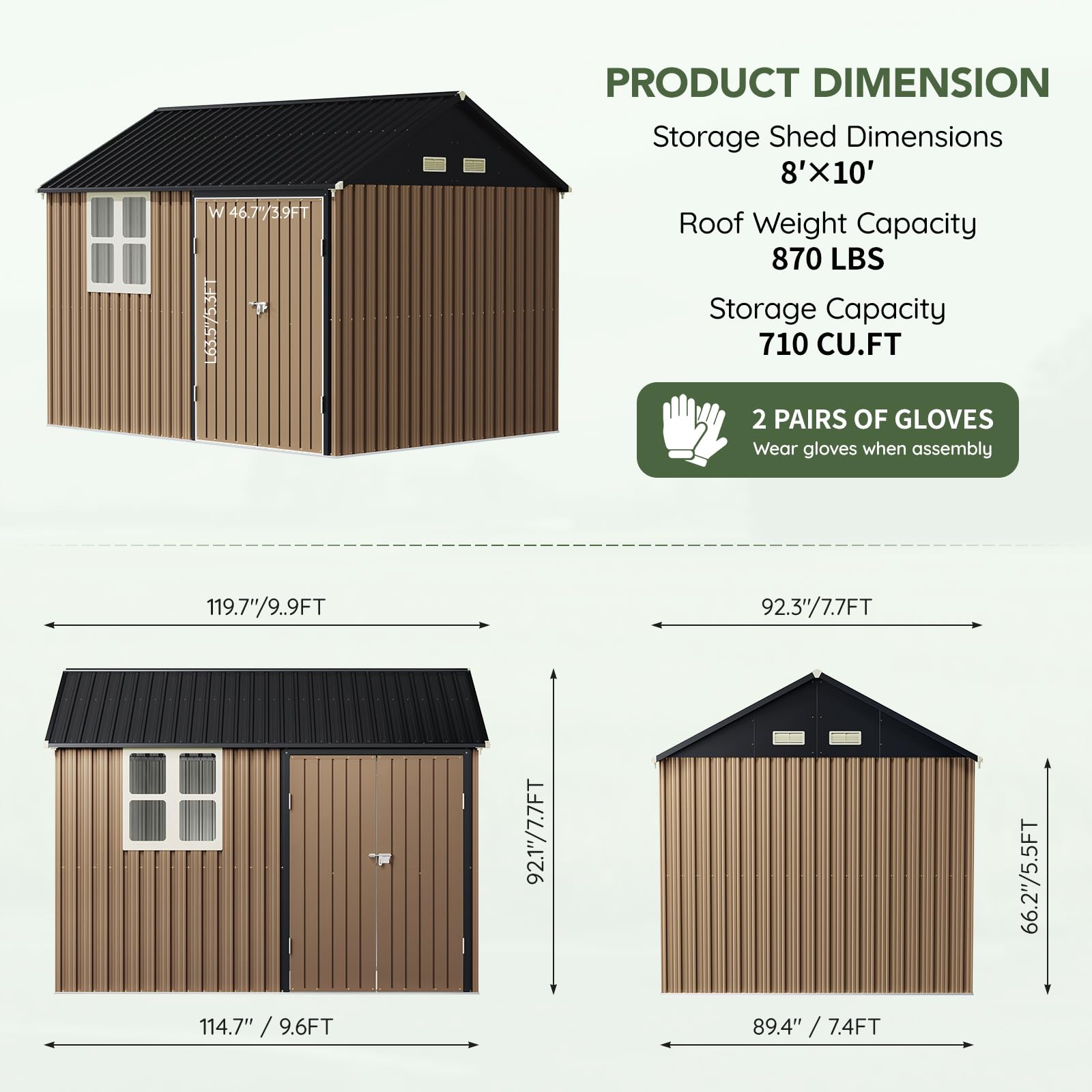 Spacious 8x10 Storage Capacity – Provides ample room to store lawn mowers, bikes, garden tools, outdoor furniture, and seasonal items, keeping your backyard organized and clutter-free.