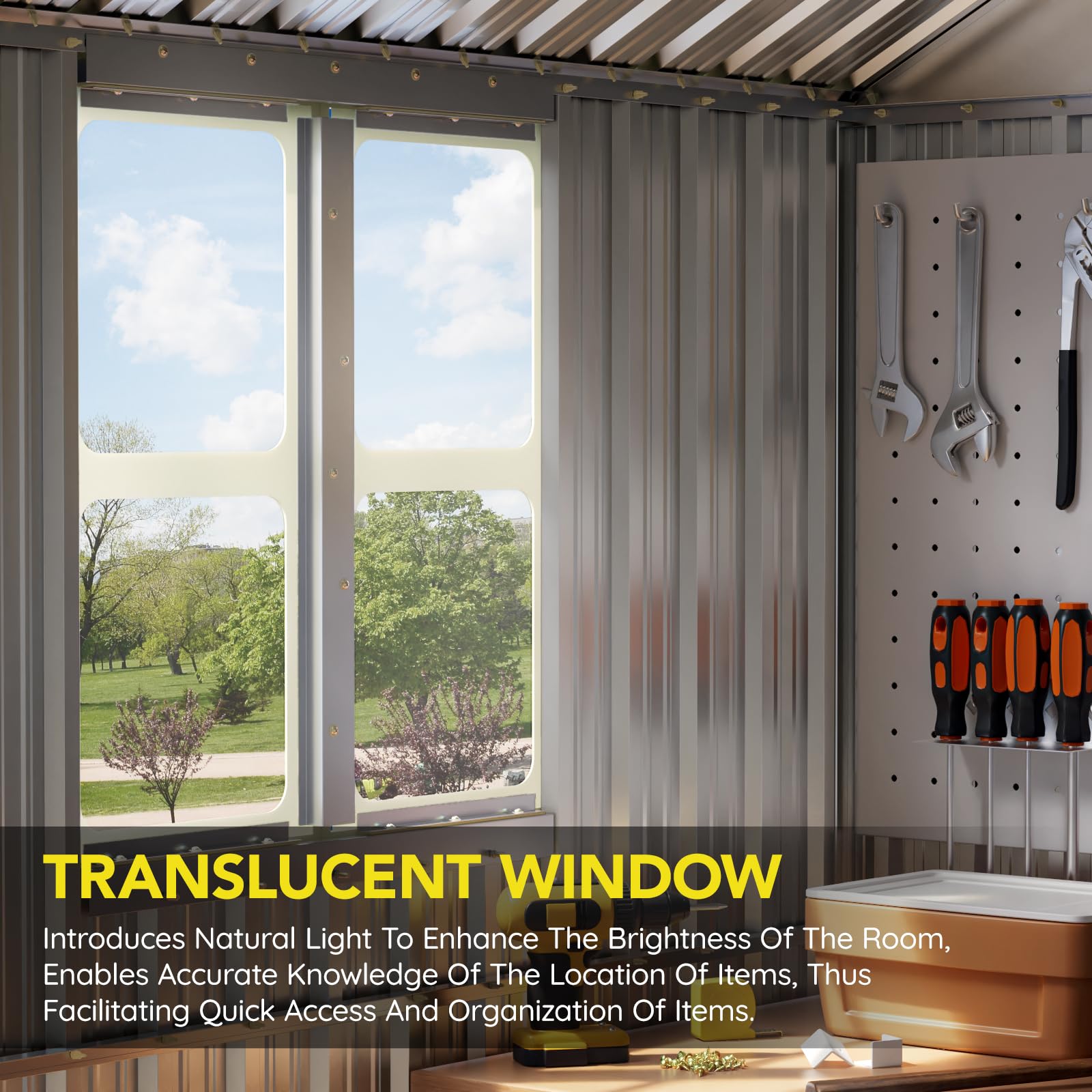 Compact & Practical: The 8x10 FT metal shed is ideal for small spaces like gardens, patios, and narrow areas, offering efficient storage without taking up much room. Bright & Accessible: Equipped with a single hinged door for convenient entry and one clear window for natural lighting. Durable Construction: Made from galvanized steel, this shed is built to withstand rain, sun, and snow while keeping your tools protected. Optional Floor Frame: Available in two versions—with or without a floor frame—to meet different base requirements and preferences. Organized Outdoor Space: Ideal for storing gardening tools, hoses, cleaning supplies, or outdoor equipment in a safe and tidy way.