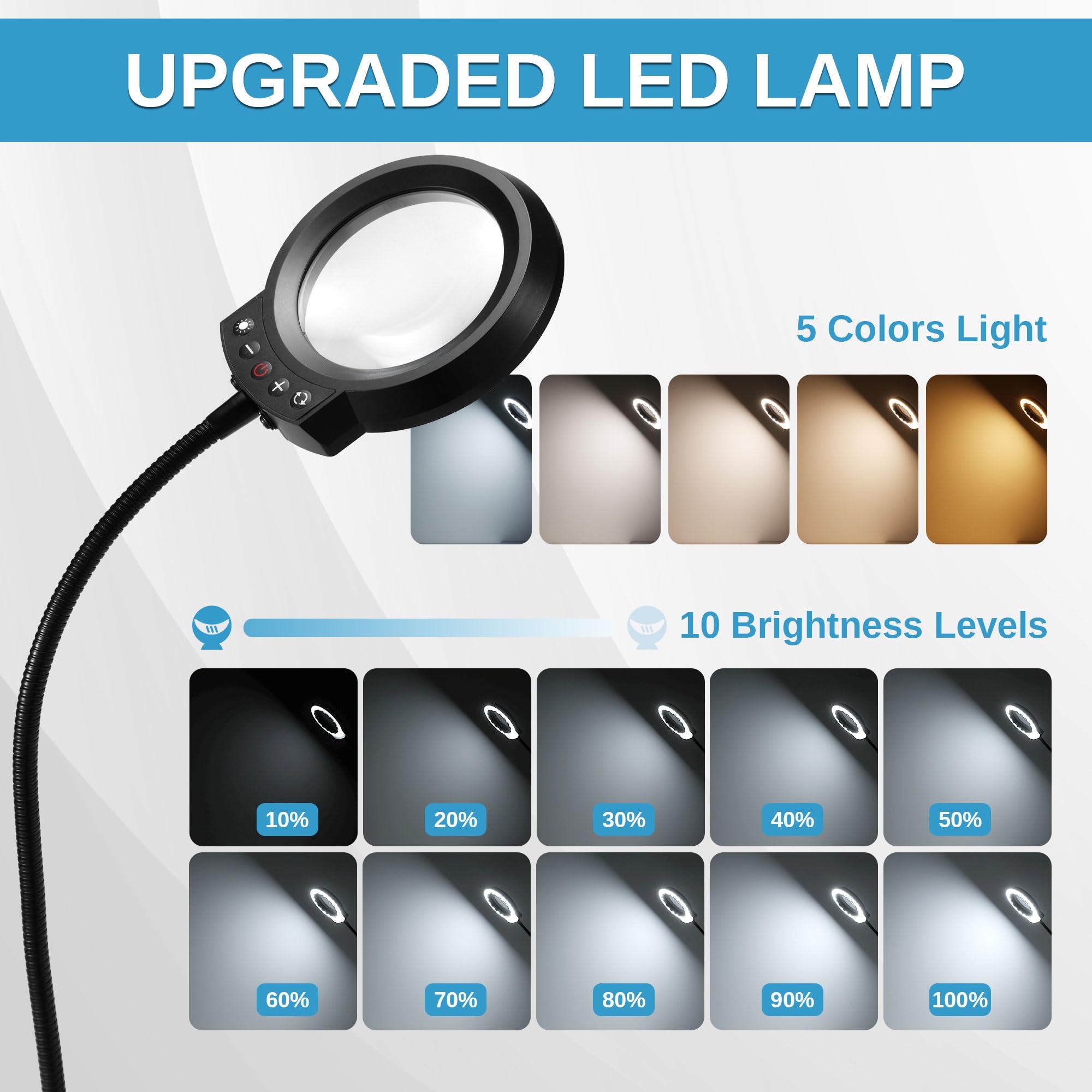 All-in-One Wireless Magnifying Lamp: The upgraded LED lamp eliminates tangled cables with a fully integrated body, delivering 5X magnification, 5 color temperatures, and 10 brightness levels—all controlled directly on the clean, minimalist light head