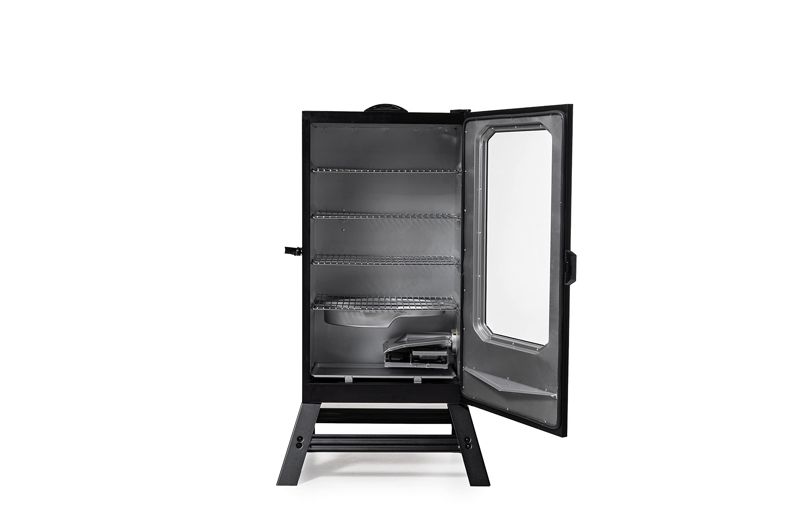Convenient window in the smoker to monitor food during smoking process. If the smoker takes longer than 60–70 minutes to heat up, ensure it is plugged directly into a wall outlet (do not use an extension cord). Make sure the door is fully closed and the latch is fastened securely.
