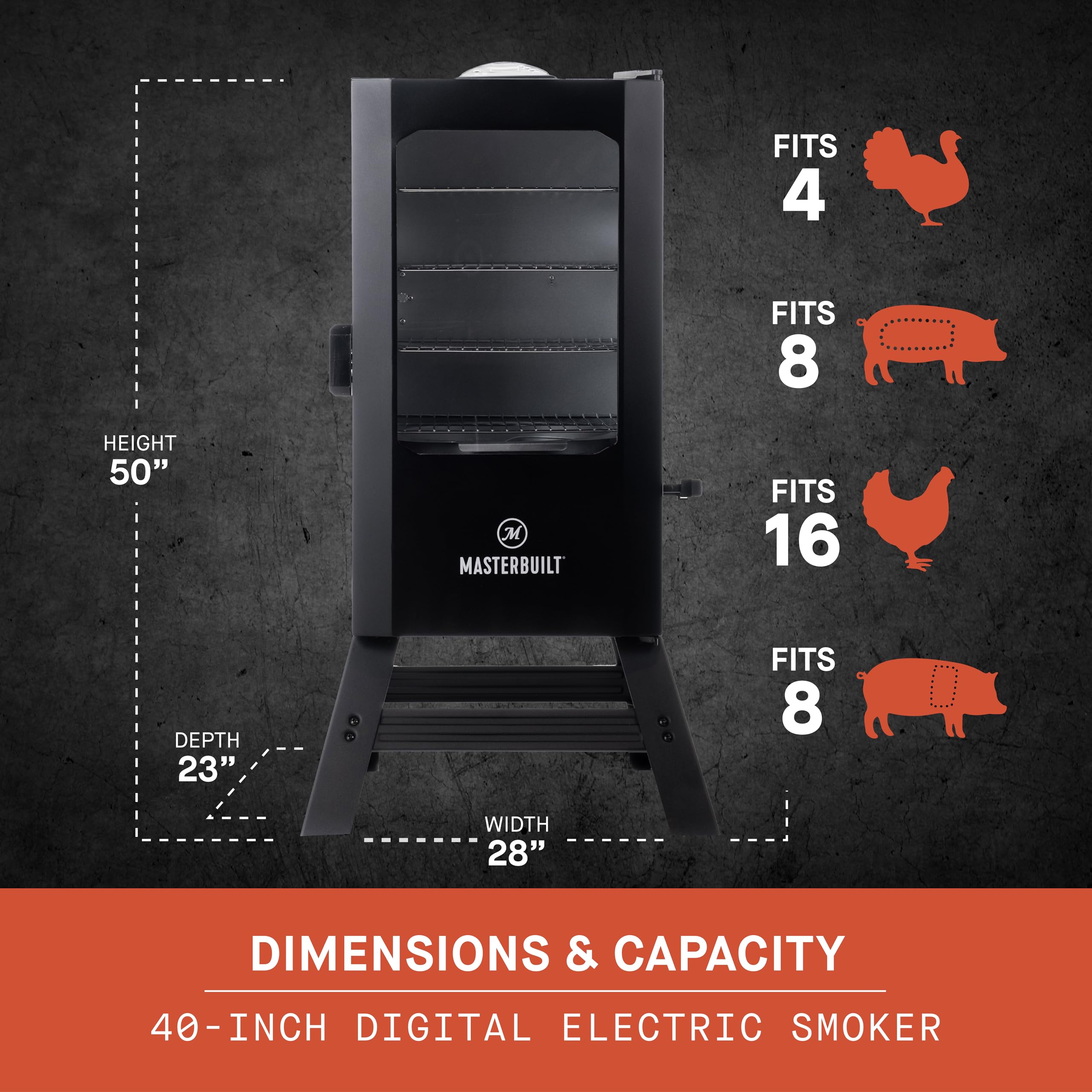 Spacious vertical design that fits up to 16 chickens, 4 turkeys, 8 pork butts or 8 racks of ribs