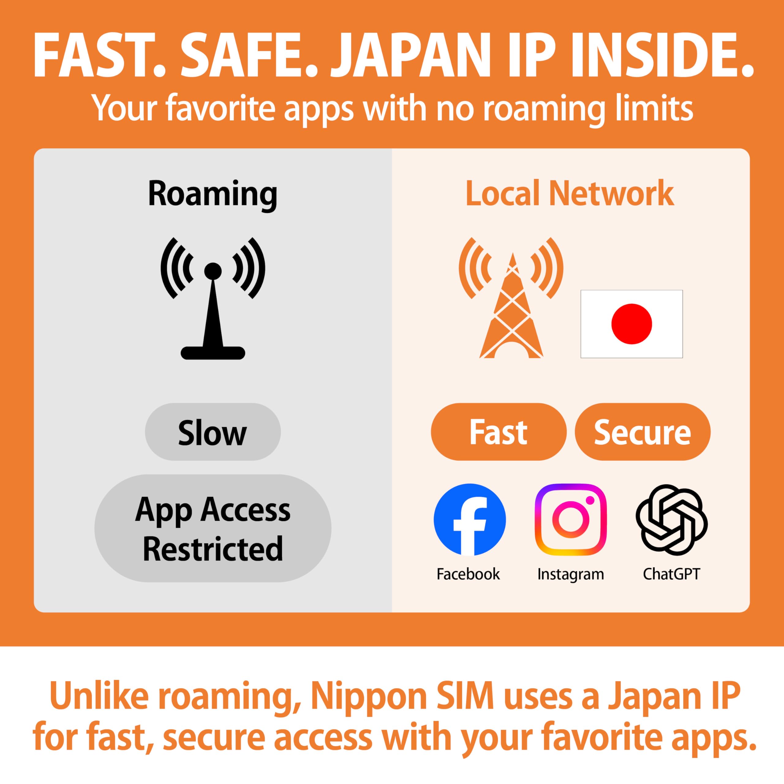 【Japan Local service for faster, securer connections】Unlike other Japan ”roaming” products, you do not need to turn on data roaming, as your connections are limited within Japan without roaming to other countries, providing you faster access with higher security.