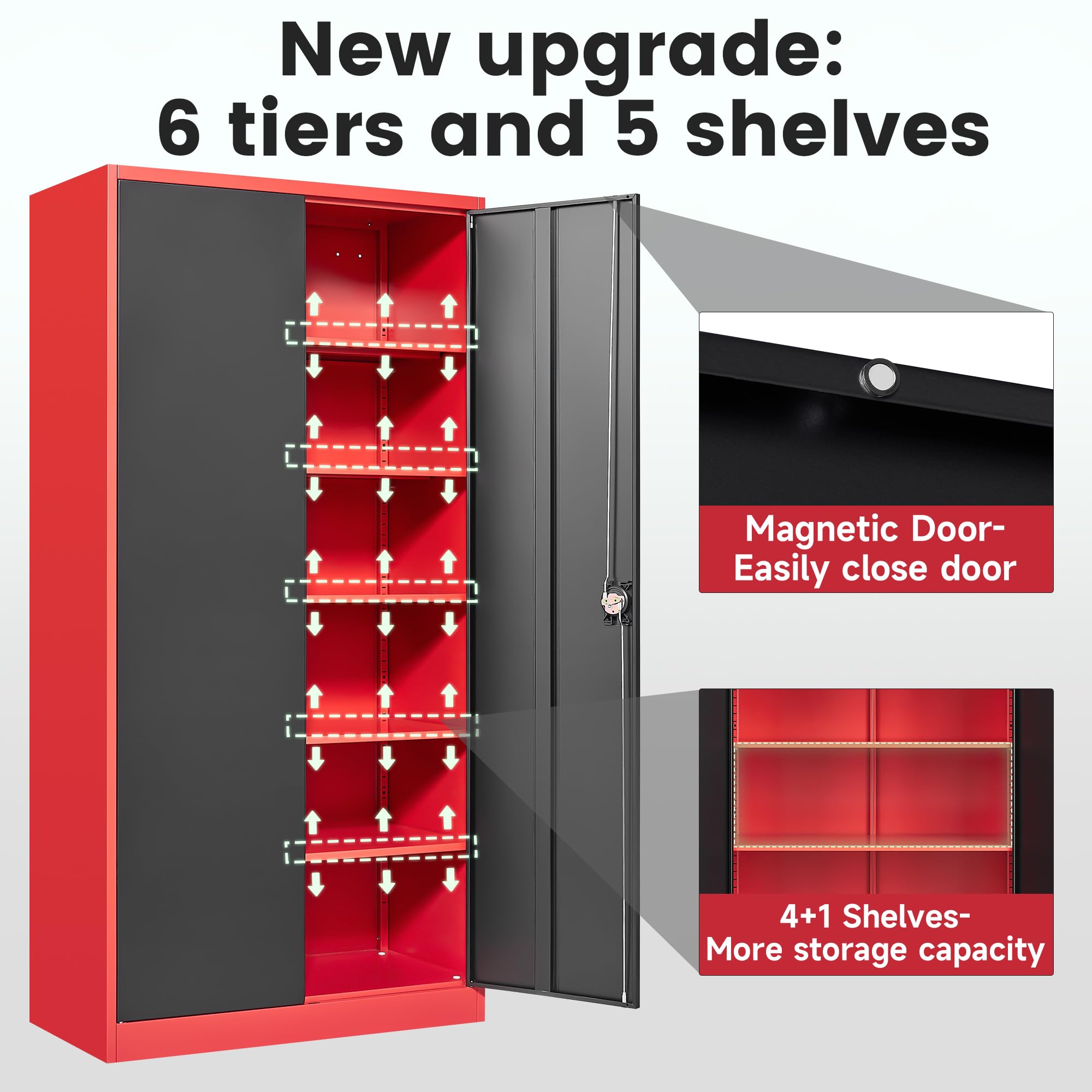 『Upgraded design』: Each door is equipped with magnetic suction, all doors can be locked;Adjustable feet for use on uneven floors; One more partition, 30% more storage space than the old model.