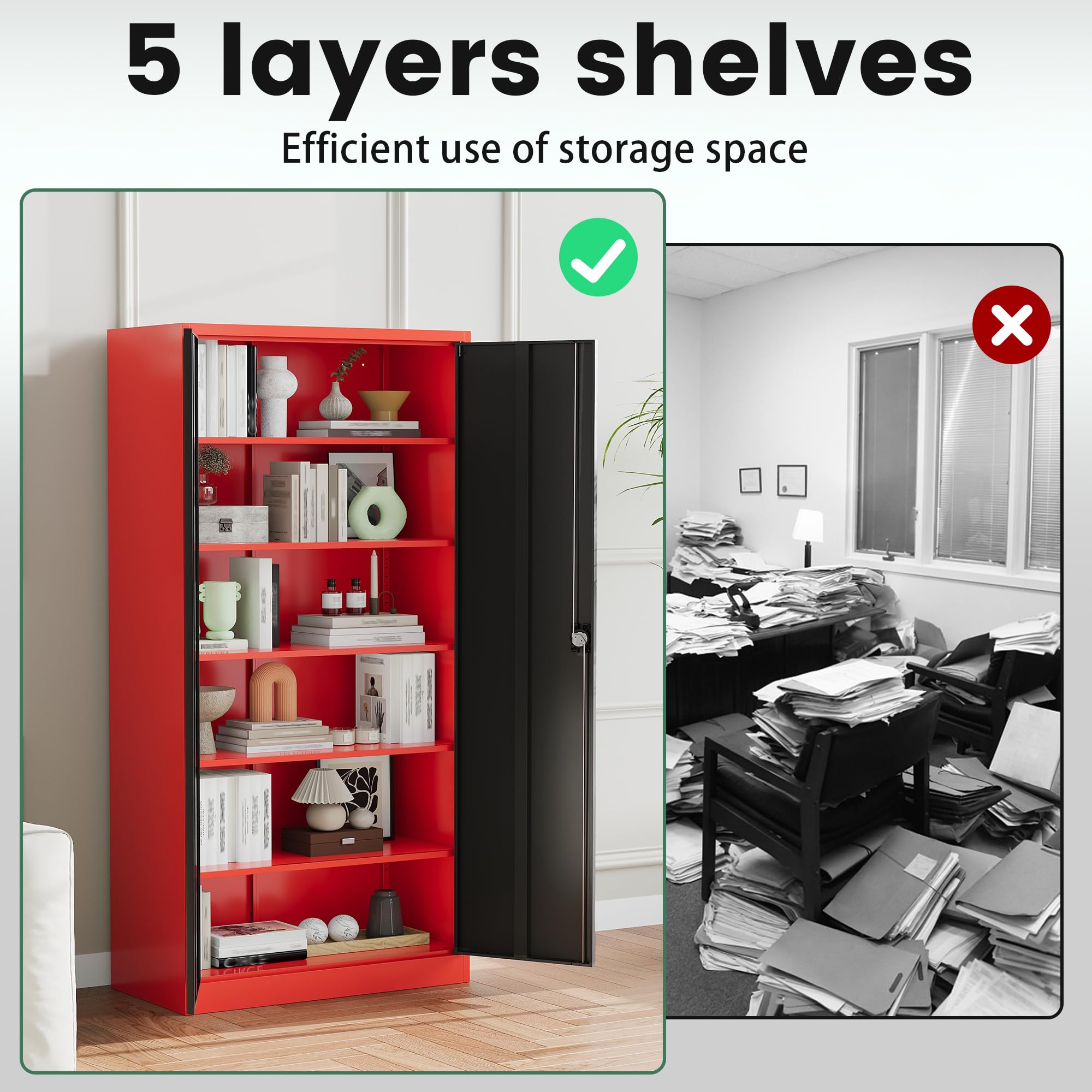 〖Unique Design〗Steel storage cabinet adopts a new black and red color scheme, which is fashionable and beautiful, perfectly blends with other home decorations.