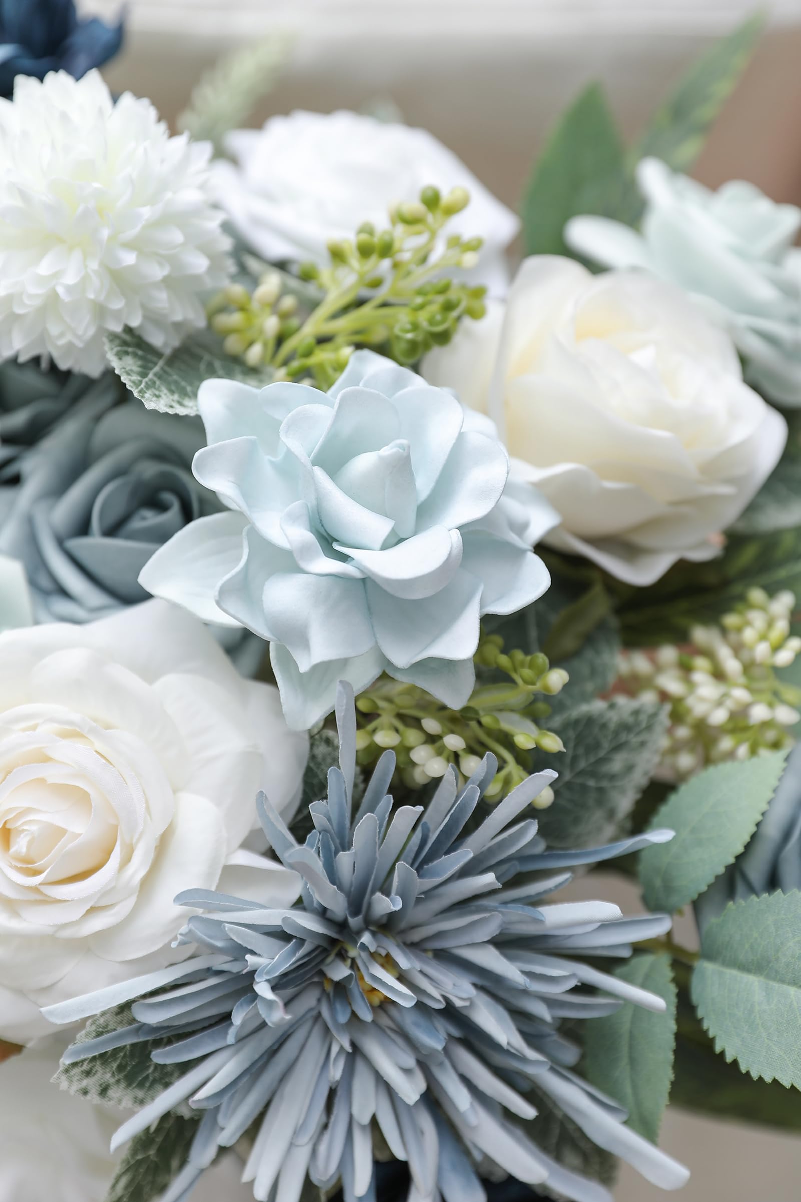 This set features blue and white artificial flowers, including silk and foam flowers of all types and different colors, ideal for bridal and bridesmaid bouquets, flower arrangements, table centers.