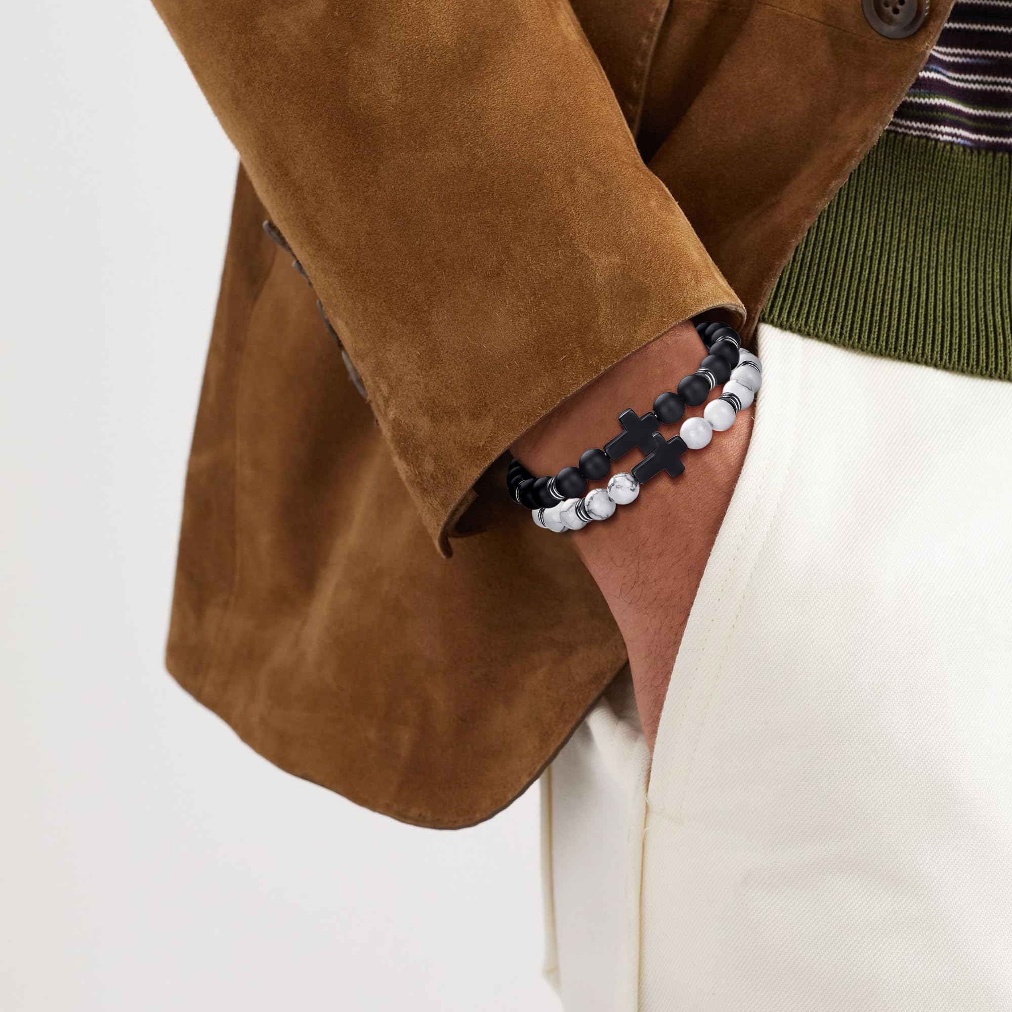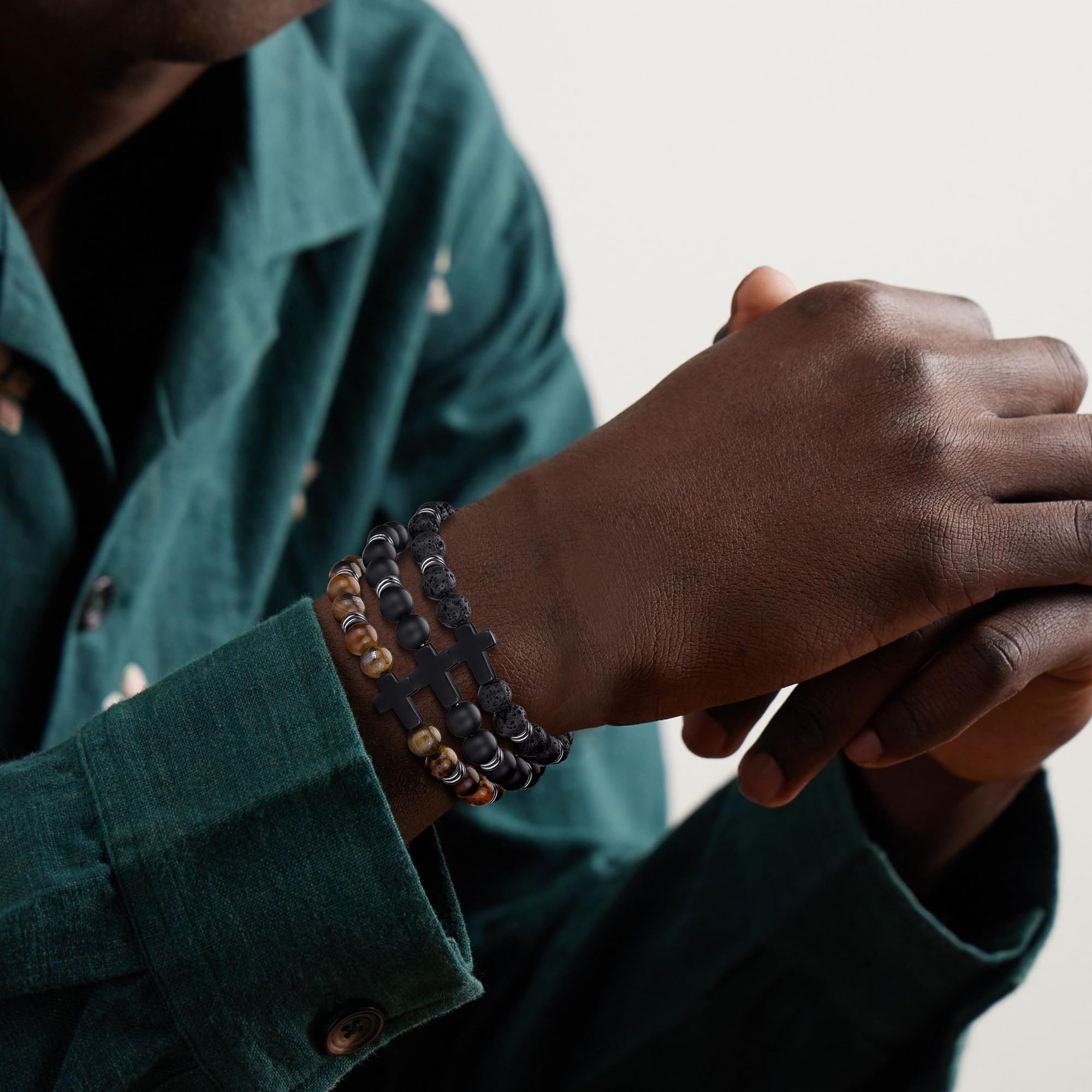 Mens Beaded Bracelet Material:Bracelet for men made of natural tiger eye stone and black matte agate,Natural stone bead possess low density and light weight. Mens bracelet cross cool feeling in hands.You can match with your other jewelry easily to complete your look.Bracelets for men cross will look great no matter what the occasion.