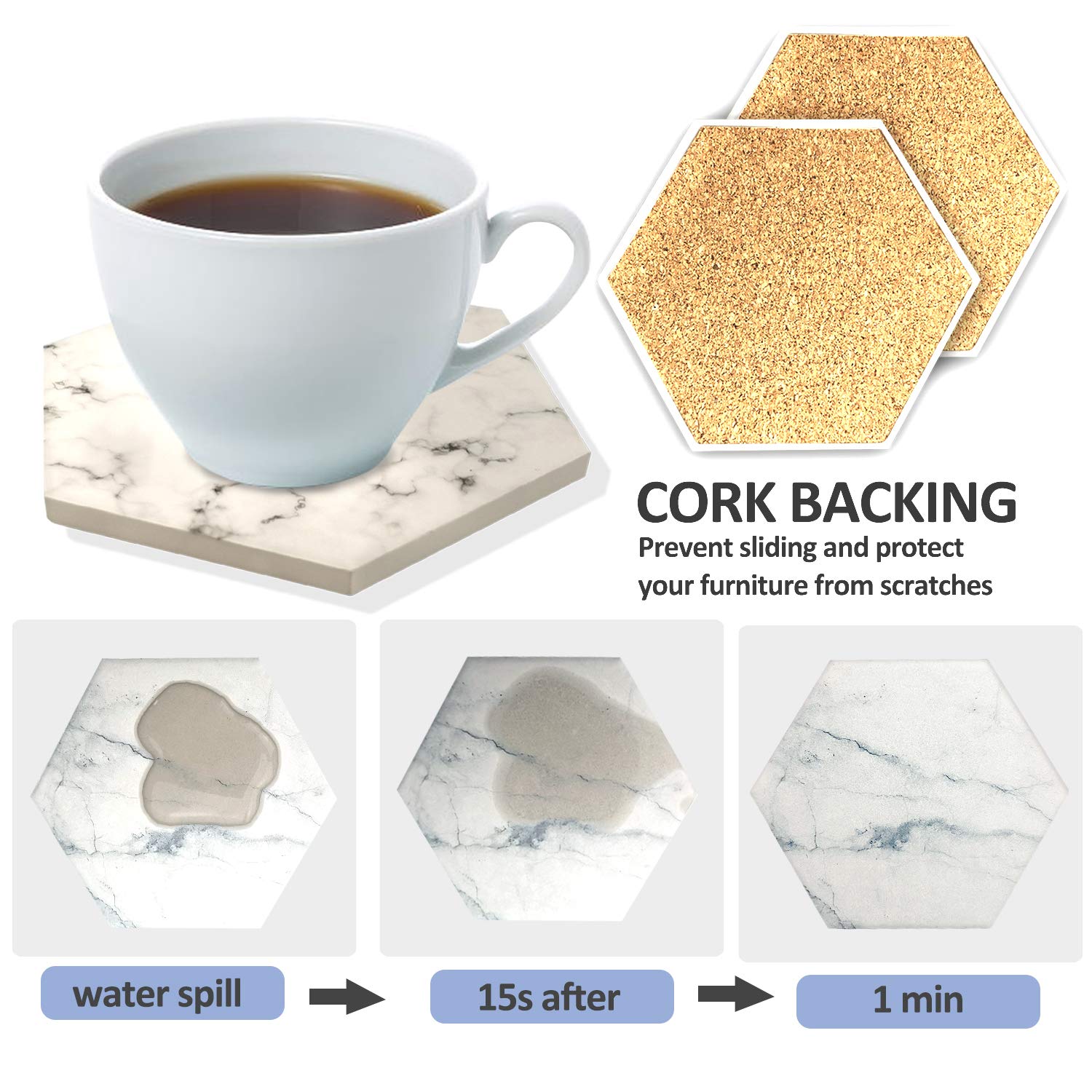 【NON-SLIP CORK BASE】 The coasters base prevents your furniture or tabletops from scratches or scuffs. The cork base prevents slipping and keeps the costers sets in place. The cork coasters for drinks absorbent also have some friction to avoid some of the shakes and bumps brought about by the disaster.