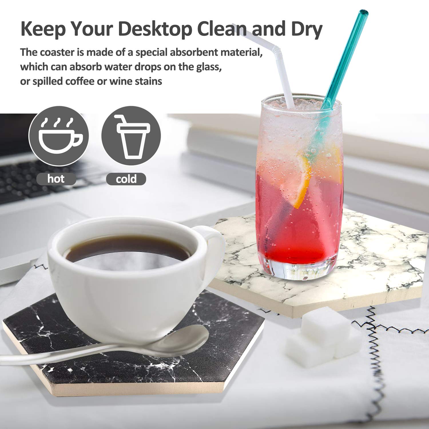 【SUPER ABSORBENT】 Our coasters marble have a ceramic surface with a realistic marble finish. Ceramic coasters absorb water and condensation from your glass, help avoid watermarks and stains on your tabletops and furniture. Good water absorption keeps your bottom dry and protects your furniture.