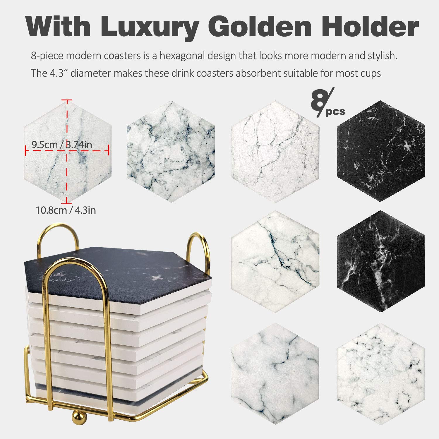 【CLASSY DESIGN】 The realistic printed marble surface is a classy touch that also allows you to store them in visible areas on counters, coffee tables, etc. The shape of the 8-piece modern coasters is a hexagonal design that looks more modern and stylish. The 4.3” diameter makes these drink coasters absorbent suitable for most cups, mugs, and bowls, a great accessory for your home, kitchen, living room, college dorm room, man cave, bar, etc.