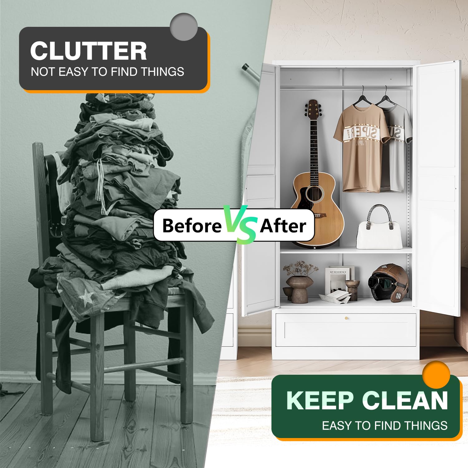 Spacious and Flexible Storage:72"H×36"W×18"D. This tall wardrobe has a large interior with a dedicated hanging rod area and adjustable shelves.This wardrobe with Storage Drawer .The large storage capacity allows you to organise clothes, accessories, office supplies and more, increasing the functionality and flexibility of your space.