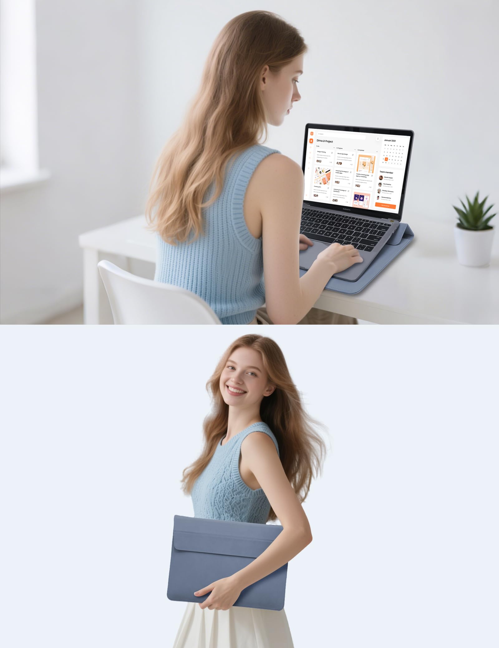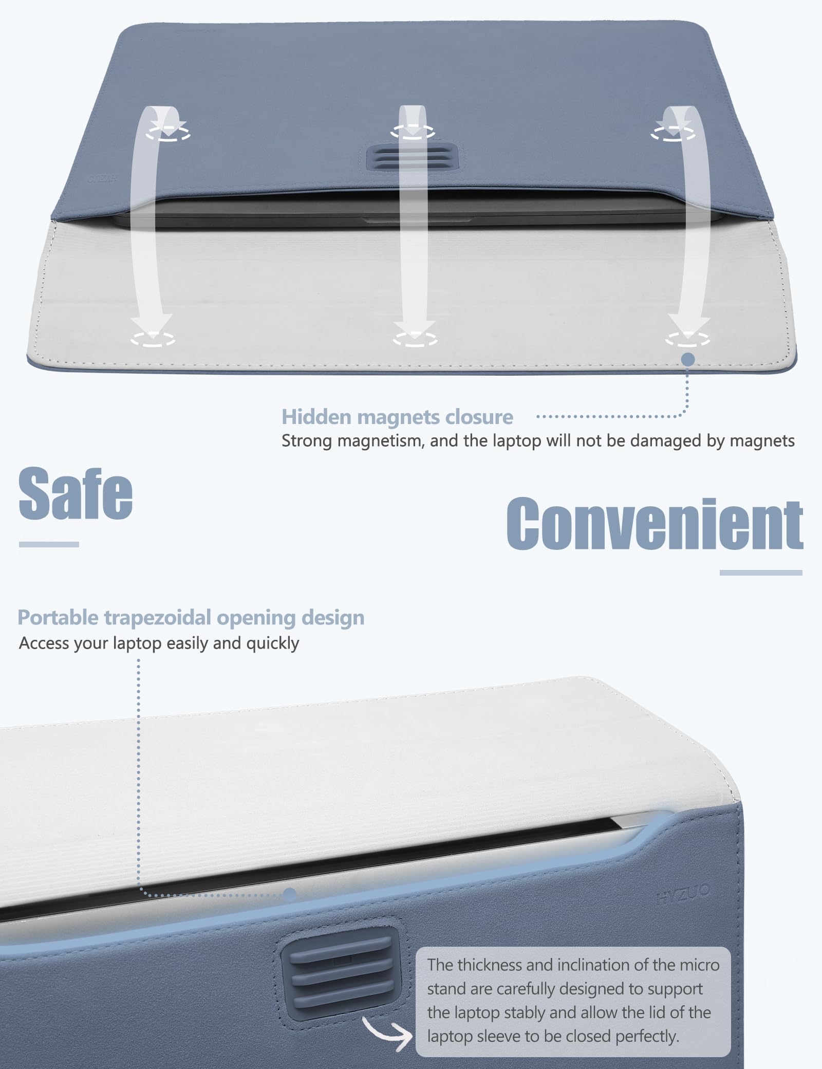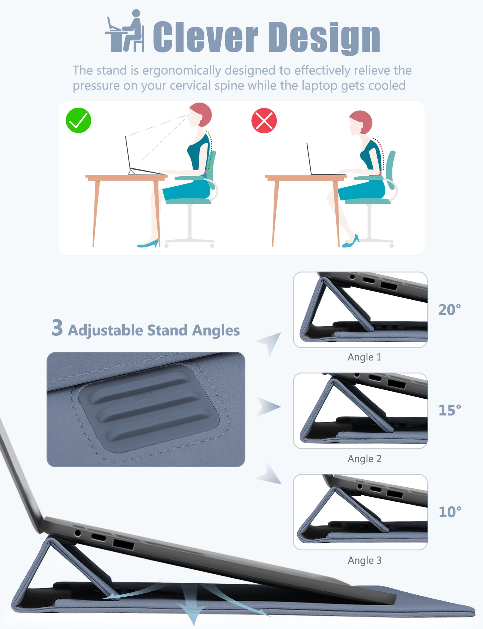 Innovative Tri-fold Stand: Original design laptop sleeve with a miniature stand that can be adjusted to 3 angles, allowing you to adjust to a healthy sitting posture and a scientific viewing angle, relieving the pressure on the cervical spine while facilitating laptop cooling. The stand is made of TPU material with high strength and aging resistance. Its thickness and tilt angle are carefully designed to support the laptop stably while enabling the lid of the laptop sleeve to be closed perfectly