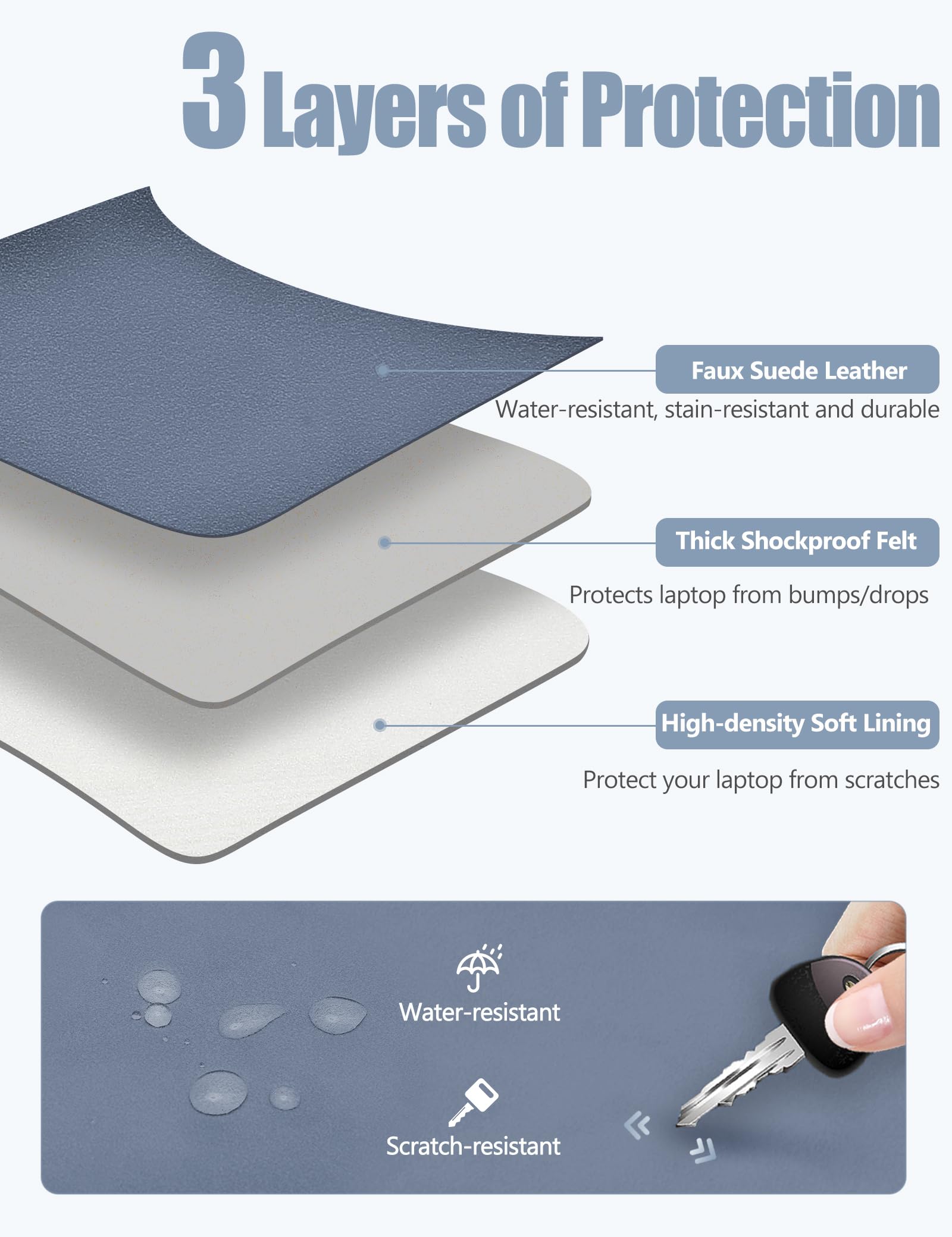 Premium Quality and Multi-purpose: The outermost fabric is faux suede leather, which is resistant to wear and tear, aging, water and dust. The middle layer is embedded with a soft microfiber felt to provide shock absorption cushioning for your laptop, preventing it from being damaged by accidental bumps or drops. The inner layer is a fine microfiber fabric that protects your laptop from scratches when you put it in/out. It can also be used as a temporary laptop pad/mouse pad