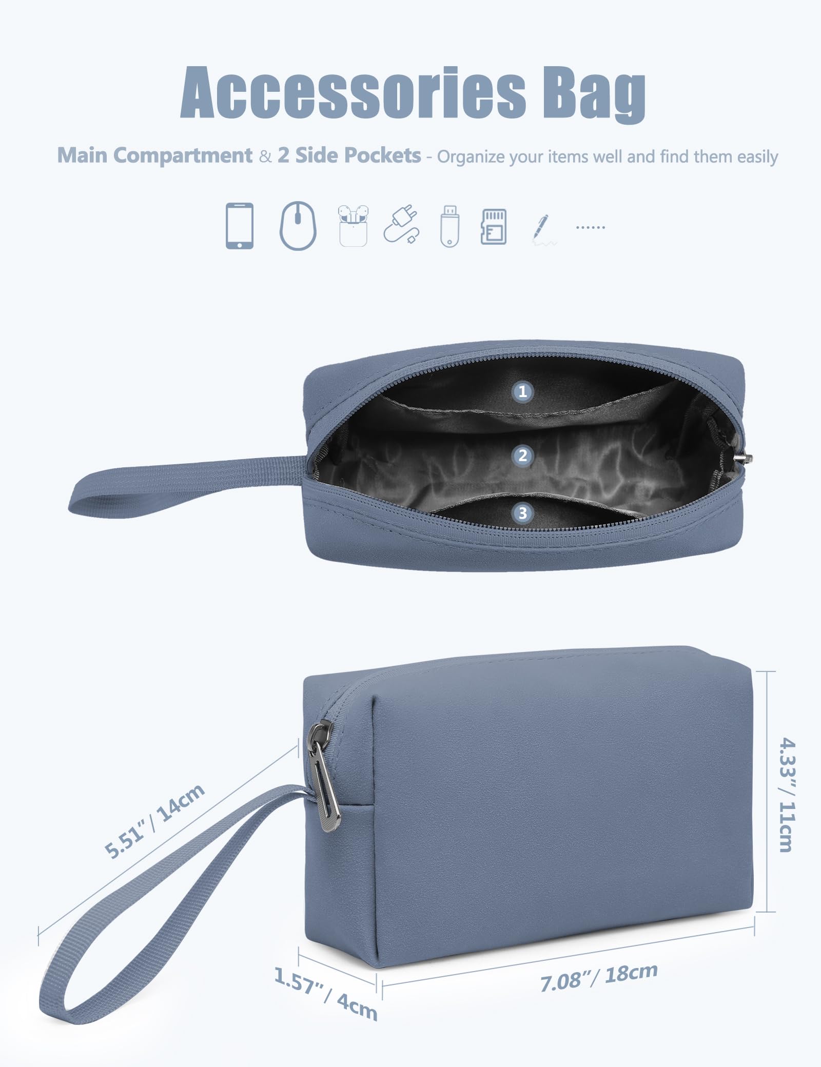 Multi-functional Storage Pouch: A matching pouch with carrying handle is included, dimension: 7.08" x 1.57" x 4.33", with 3 interior compartments, allowing you to easily store daily electronic accessories or gadgets organized in one place and easy to find. There is a handle on the side for easy carrying. Its compact size is extremely flexible and can be carried alone or easily packed into a laptop bag, backpack or suitcase. It can also be used as a cosmetic bag or healthcare kit bag, etc.