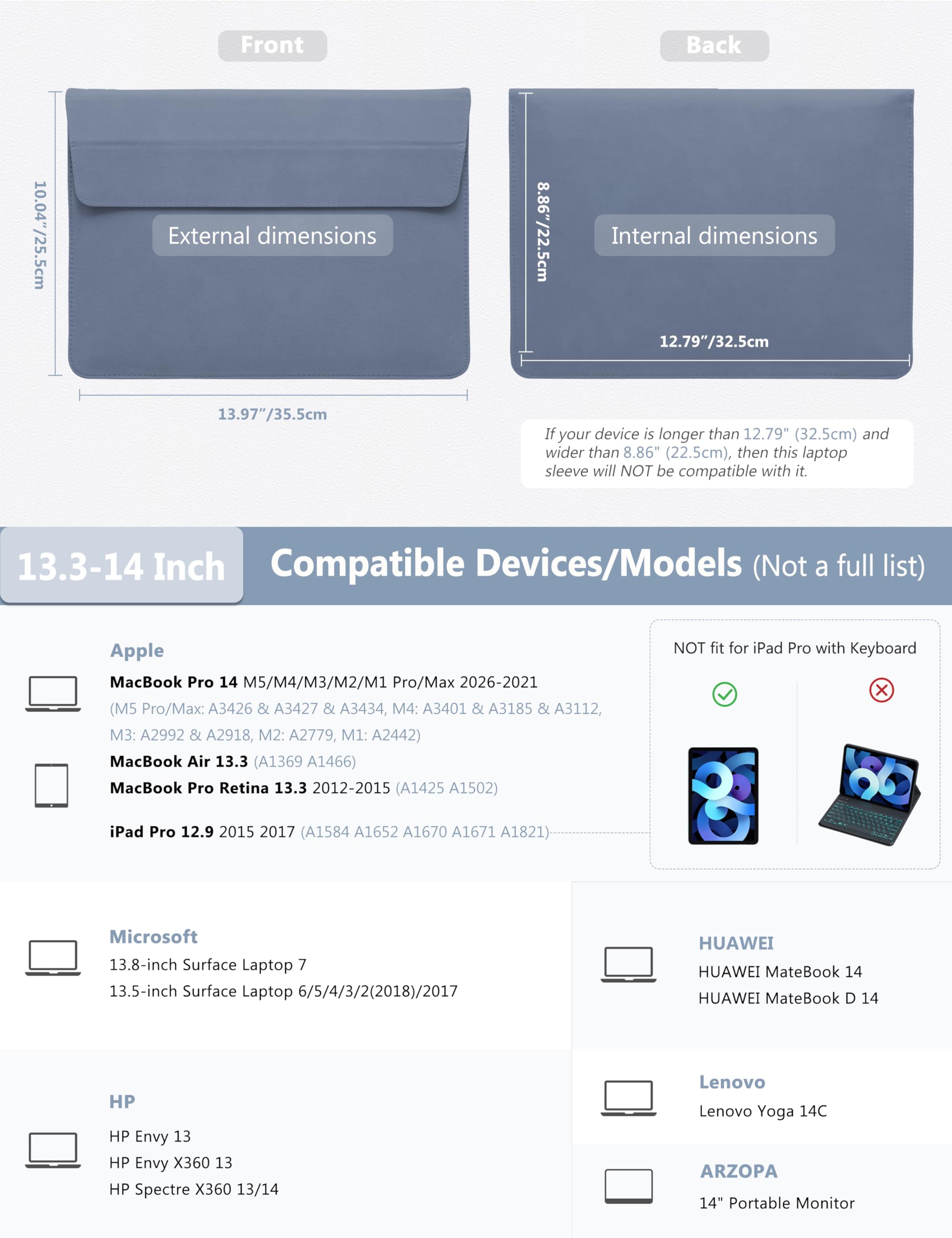 Internal Dimensions: 12.79" x 8.86" (32.5 cm x 22.5 cm). Compatible with 2026-2021 MacBook Pro 14 M5/M4/M3/M2/M1 Pro/Max (A3426, A3427, A3434, A3401, A3185, A3112, A2992, A2918, A2779, A2442), 13.8"/13.5" Surface Laptop 7/6/5/4/3/2 (2018)/2017, MacBook Air 13.3 2012-2017 (A1369/A1466), MacBook Pro 13 2012-2015 (A1425/A1502). Also compatible with HP Envy 13, HP Envy X360 13, HP Spectre X360 13/14, Huawei MateBook 14, Lenovo Yoga 14C 2021, ARZOPA 14" Portable Monitor, Lenovo Yoga 720/910/920, etc.