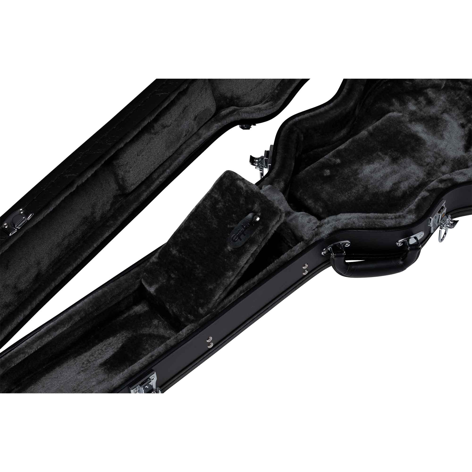 This black, Tolex Epiphone Les Paul Hardshell Case is just what you need to protect your Les Paul guitar from the rigors of the road. The plush-lined, hardshell case serves as a shock absorber with an inner compartment to hold extra strings, straps, picks, slides, etc.