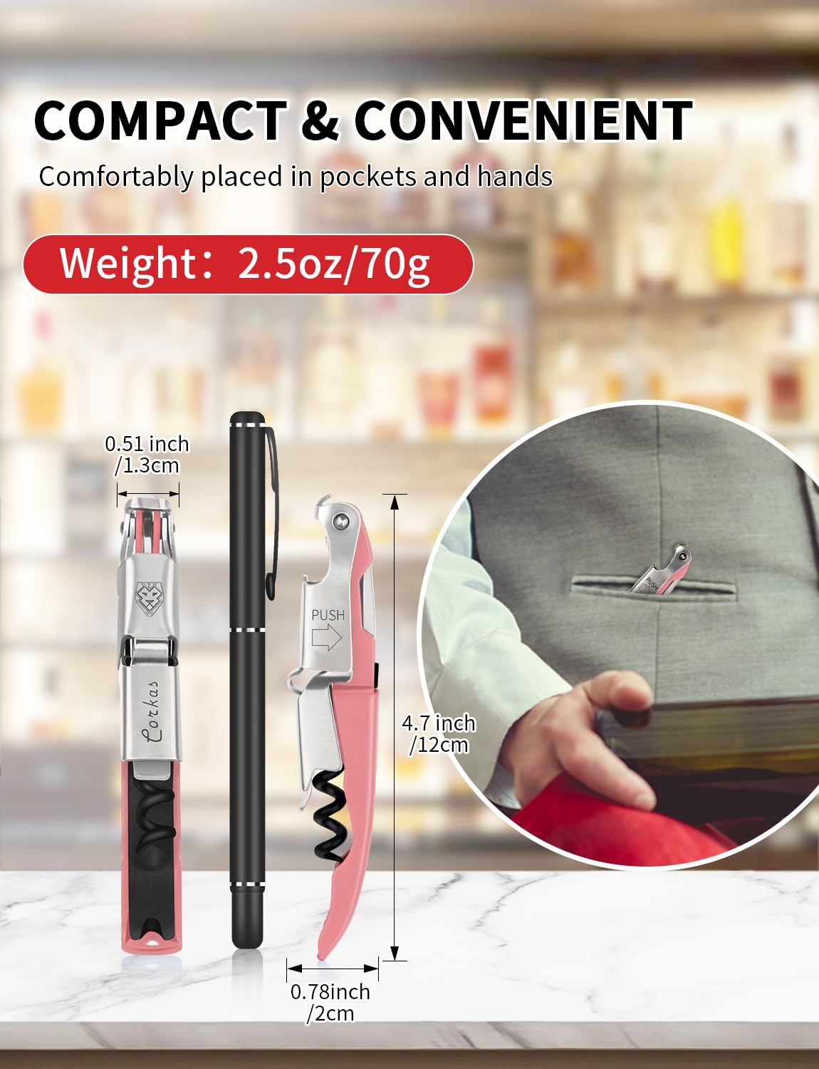 ✅【POCKET-SIZED POWERHOUSE FOR WINE LOVERS】Don't be fooled by its size! This meticulously handcrafted corkscrew (4.7" x 0.78") is a powerhouse in disguise. Despite its compact design with weight only 2.5 ounces, The tighted pivot points, optimized curvature of the handle ensure heavy duty and comfortable to use in your hand. It effortlessly tackles any cork, at home, at gatherings, or even on picnics. This wine key fits well in your pocket, always ready to elevate your next wine experience.