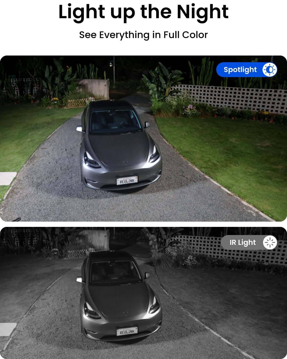 FULL-COLOR NIGHT VISION WITH SPOTLIGHTS: Gain more detailed and convincing evidence at night with the color night vision enabled by the spotlight. The illumination of the 700-lumen spotlight also provides an effective way to deter intruders.