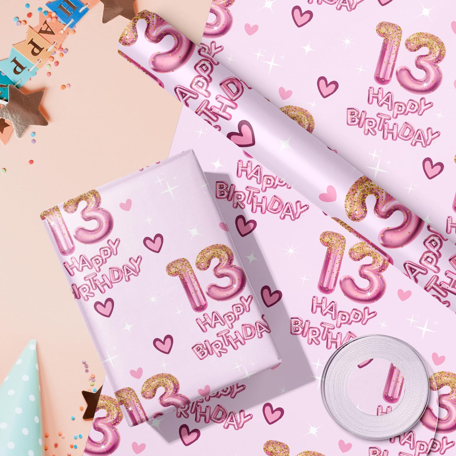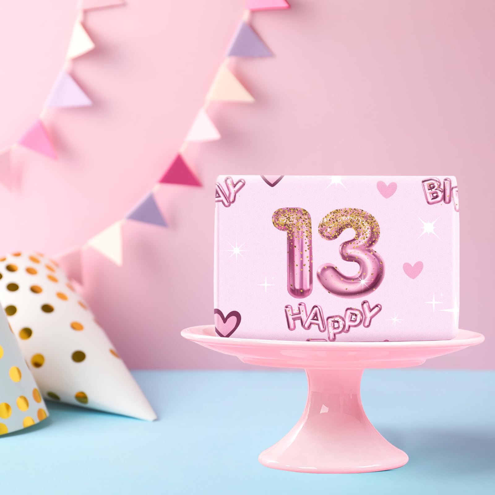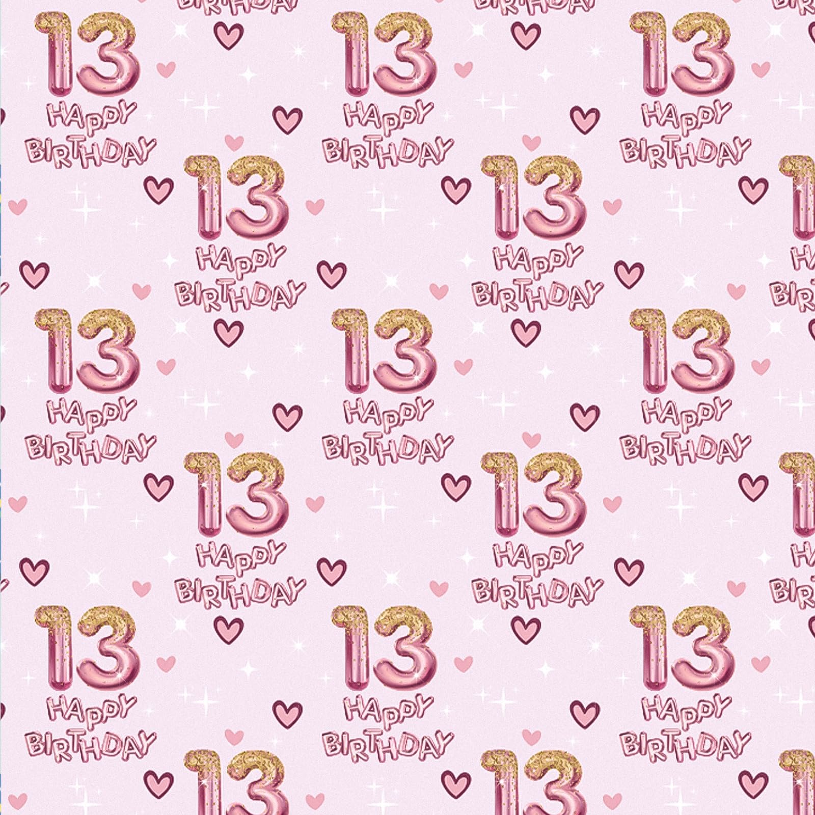 Vibrant Design: Wrapping paper printed pink number 13 balloons, hearts and "HAPPY BIRTHDAY" text on pink background that adds excitement to any gift, making it perfect for girls' birthday parties