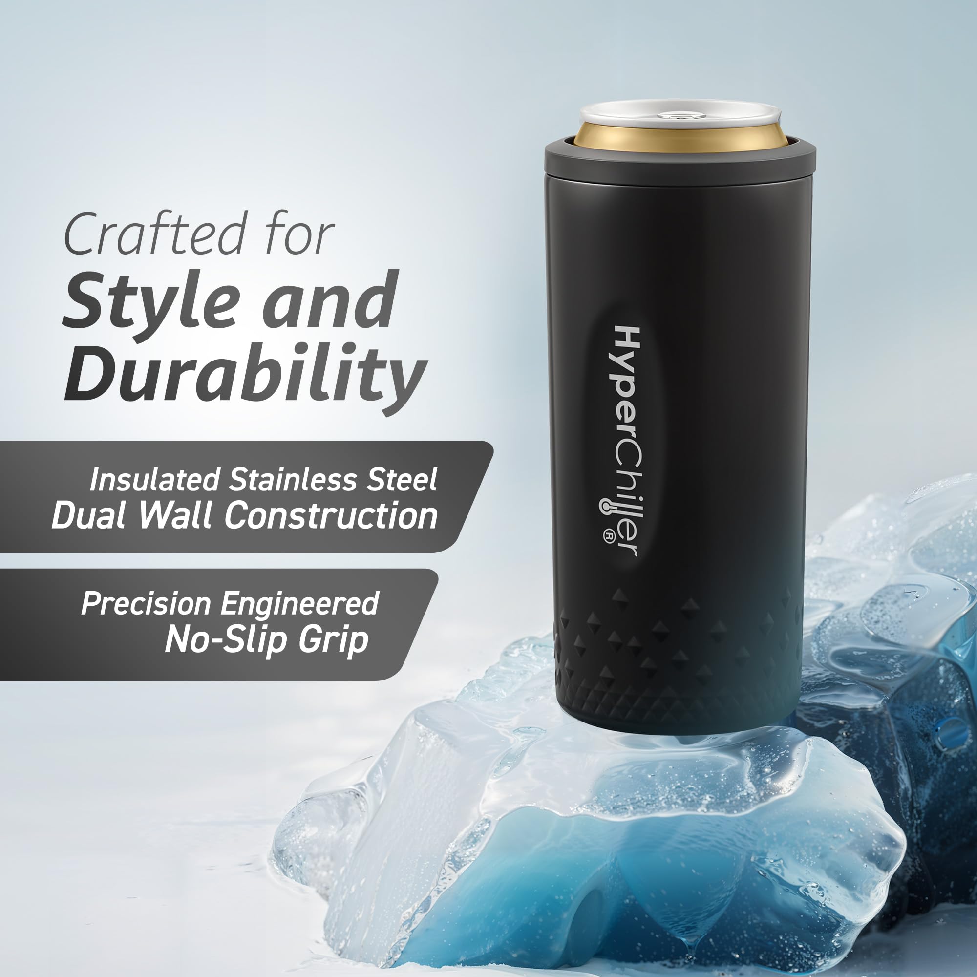 ALWAYS ICE COLD, ALWAYS DELICIOUS From start to finish. With its Dual-Wall vacuum & insulated stainless-steel construction, the HyperChiller SLIM keeps canned beverages icy cold for hours!