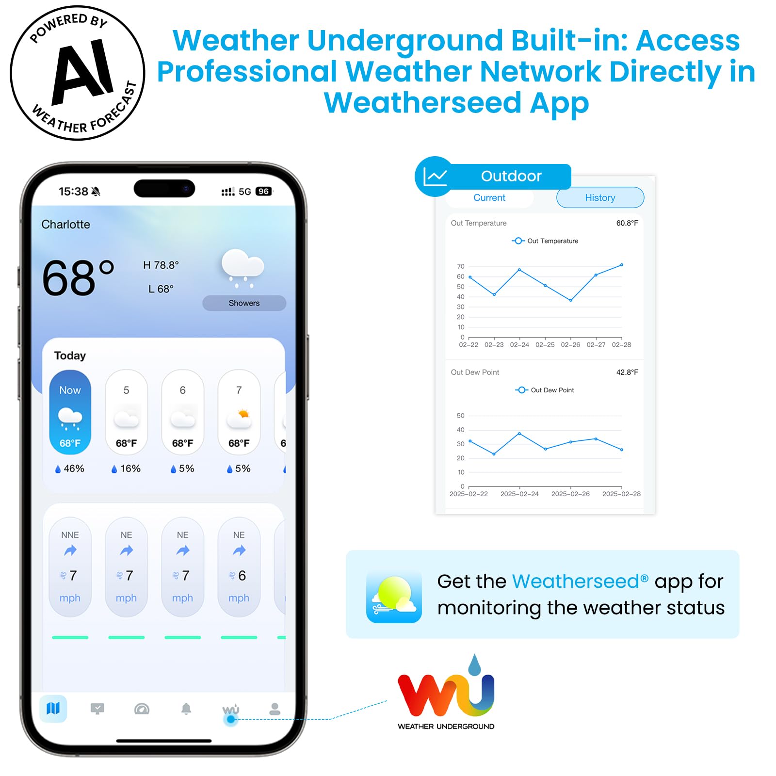 ๐ช๐ถ๐๐ถ + ๐ช๐ฒ๐ฎ๐๐ต๐ฒ๐ฟ๐๐ฒ๐ฒ๐ฑ ๐๐ฝ๐ฝ + ๐ฎ๐ฐ/๐ณ ๐๐ ๐๐ผ๐ฟ๐ฒ๐ฐ๐ฎ๐๐ & ๐๐น๐ฒ๐ฟ๐๐: Connect via WiFi to our Weatherseed app for AI-driven 24/7 weather monitoring and forecasts. Receive instant alerts for critical changes in temperature, humidity, and barometric pressure directly on your smartphone, empowering decisions for home, garden, or outdoor activities.