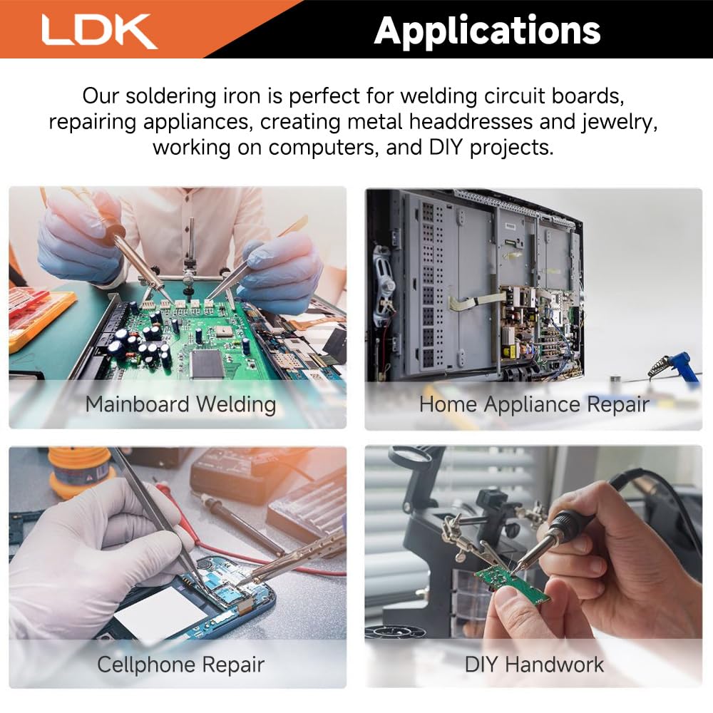 Fast and Precise Heating: LDK Soldering Station utilizes the latest temperature control technology to heat up fast, reaching 662°F in 30 seconds. The temperature can be adjusted from 392~896°C, ensuring precise and efficient welding.