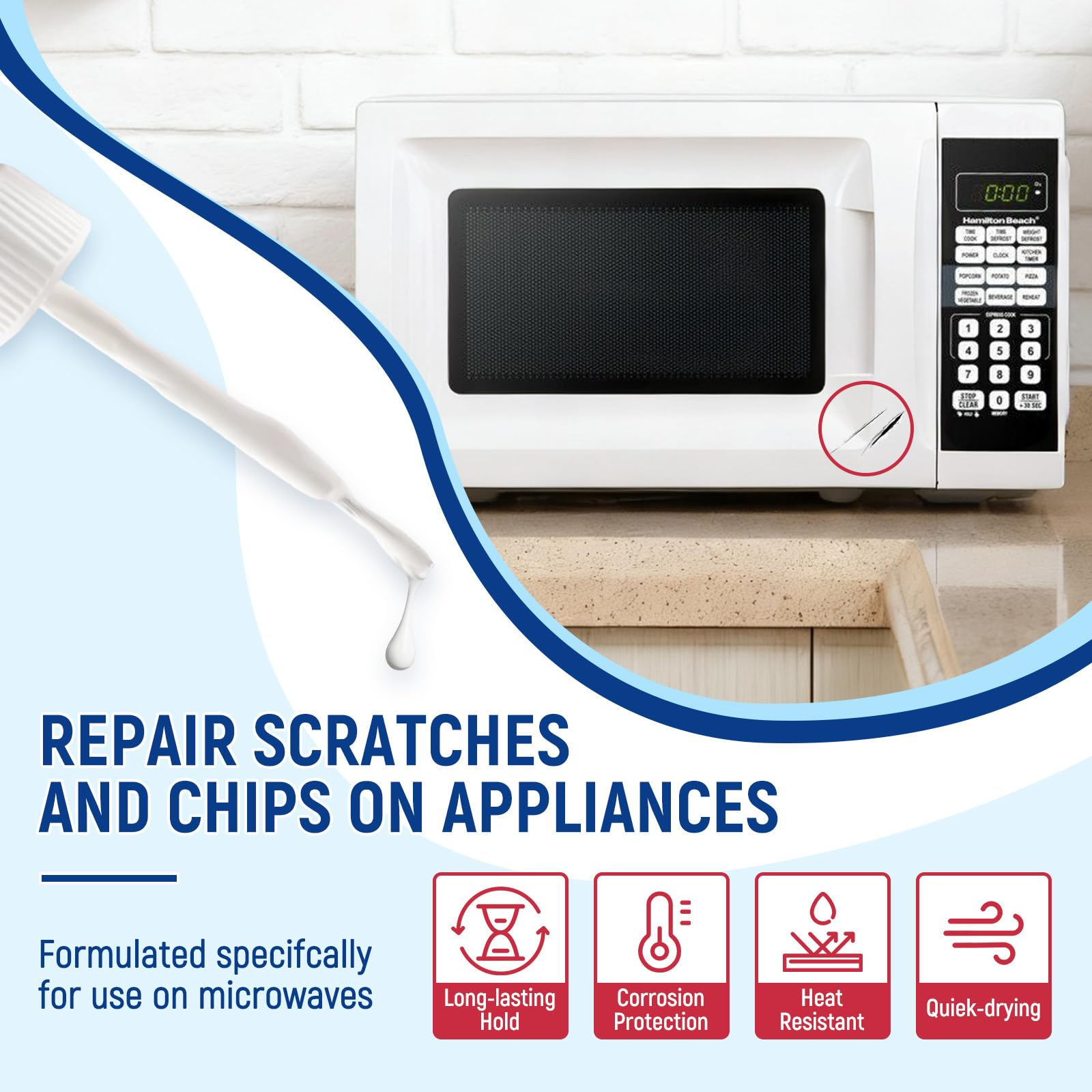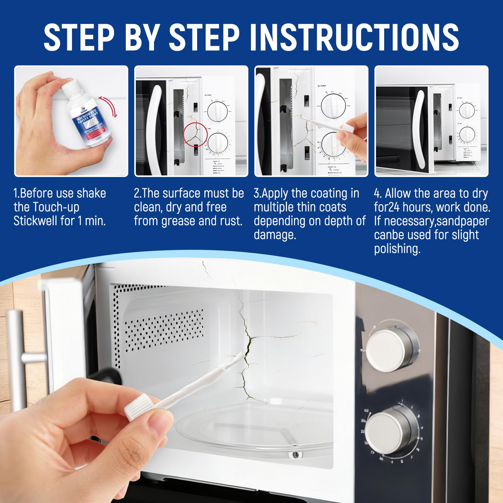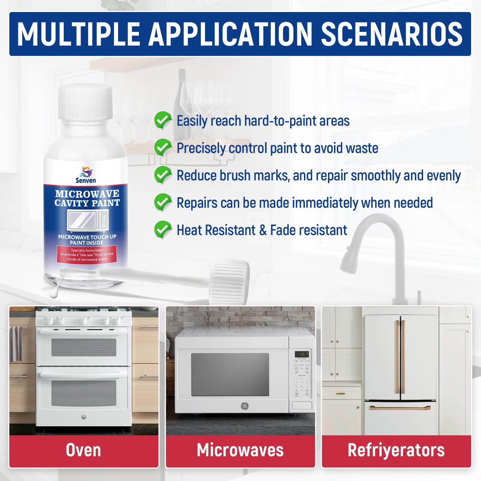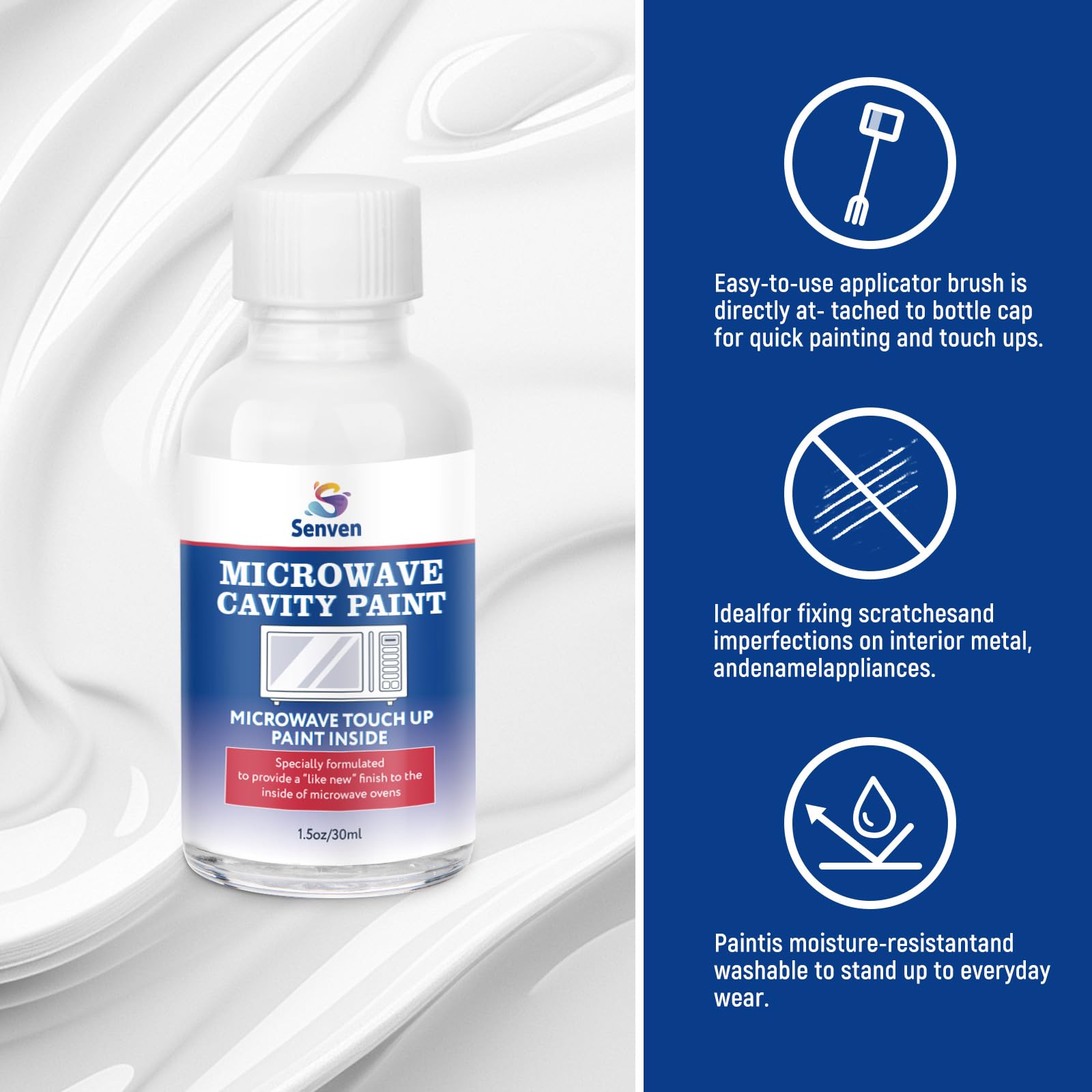 Safe & Low Odor: SENVEN Microwave Oven Paint is made from a water-based acrylic quality formula; safe for the elderly and pets; no odor and ultra-low emission; ideal for small chips, spots, cracks, scratches