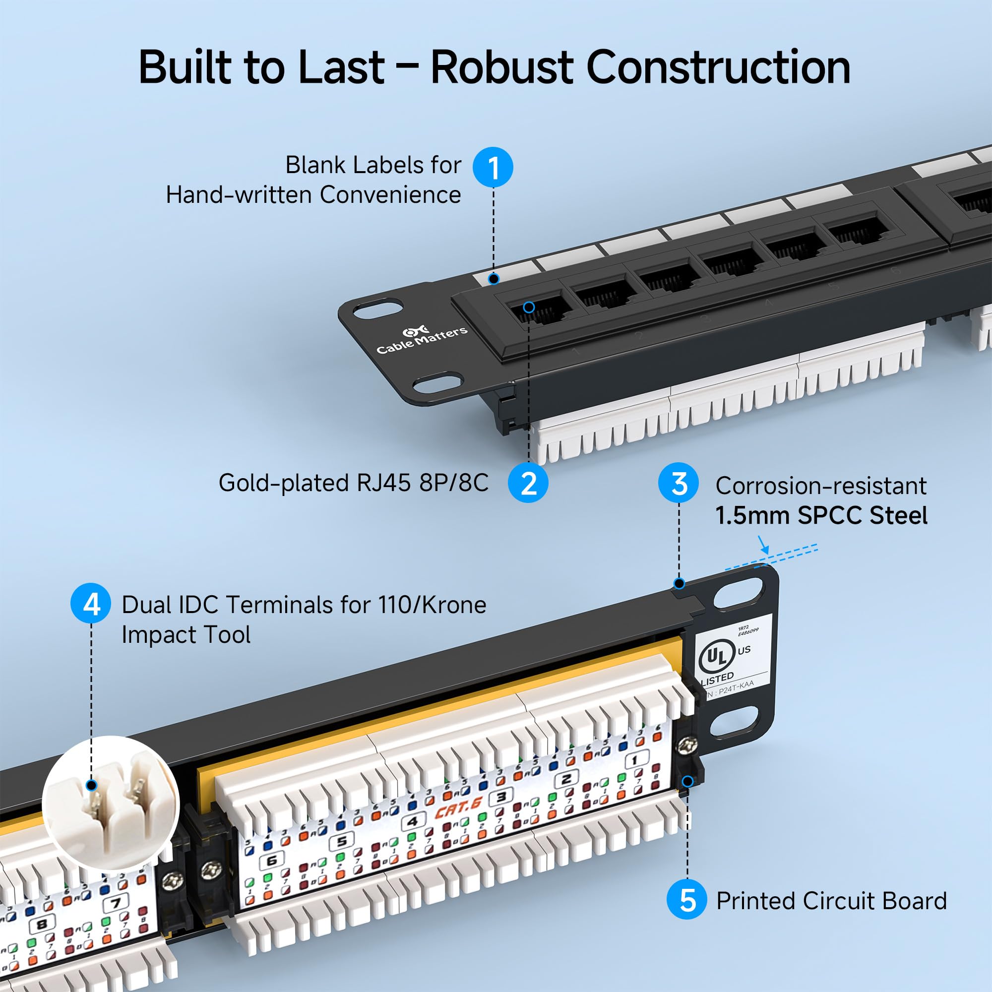 Compliant with UL Fire Safety Standards: This UL-listed network patch panel complies with fire safety requirements (E486099), ensuring safe and reliable operation. The included D-rings and cable ties make cable management easy, keeping your network organized and reducing clutter.