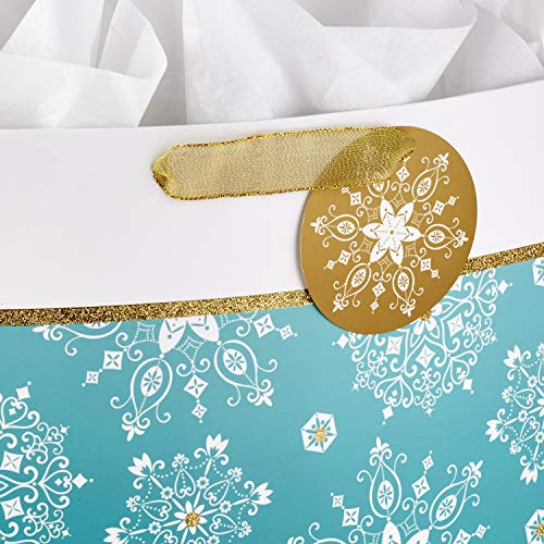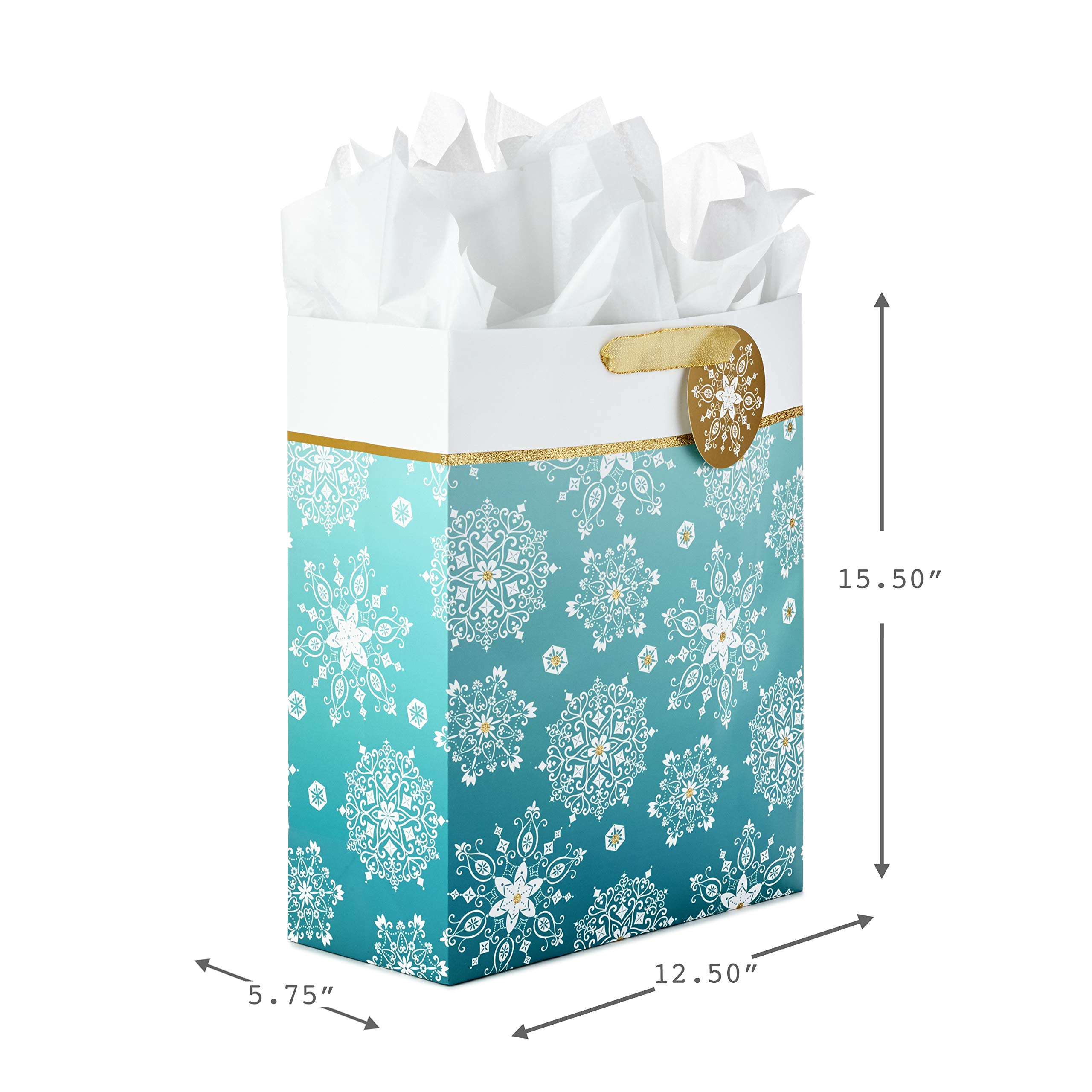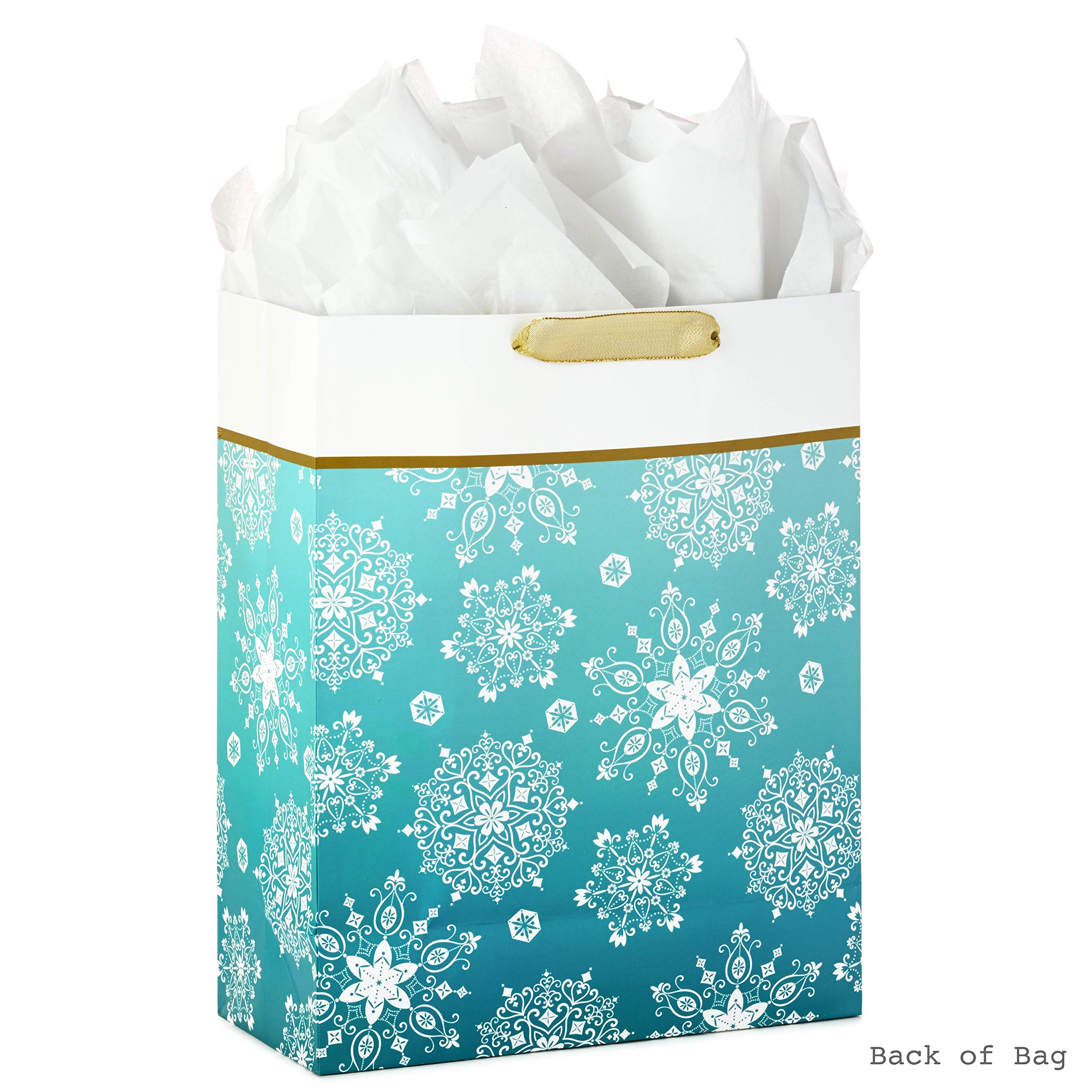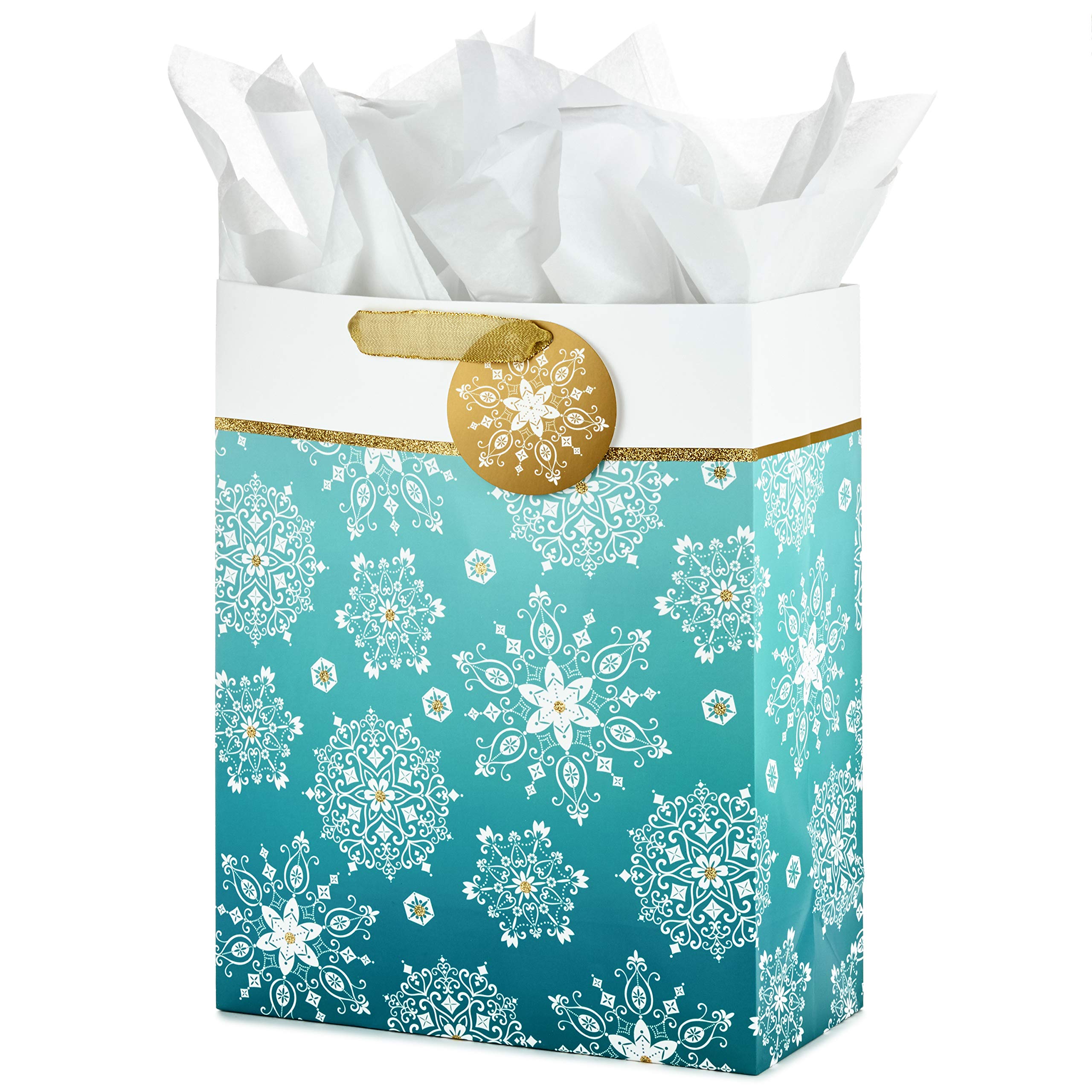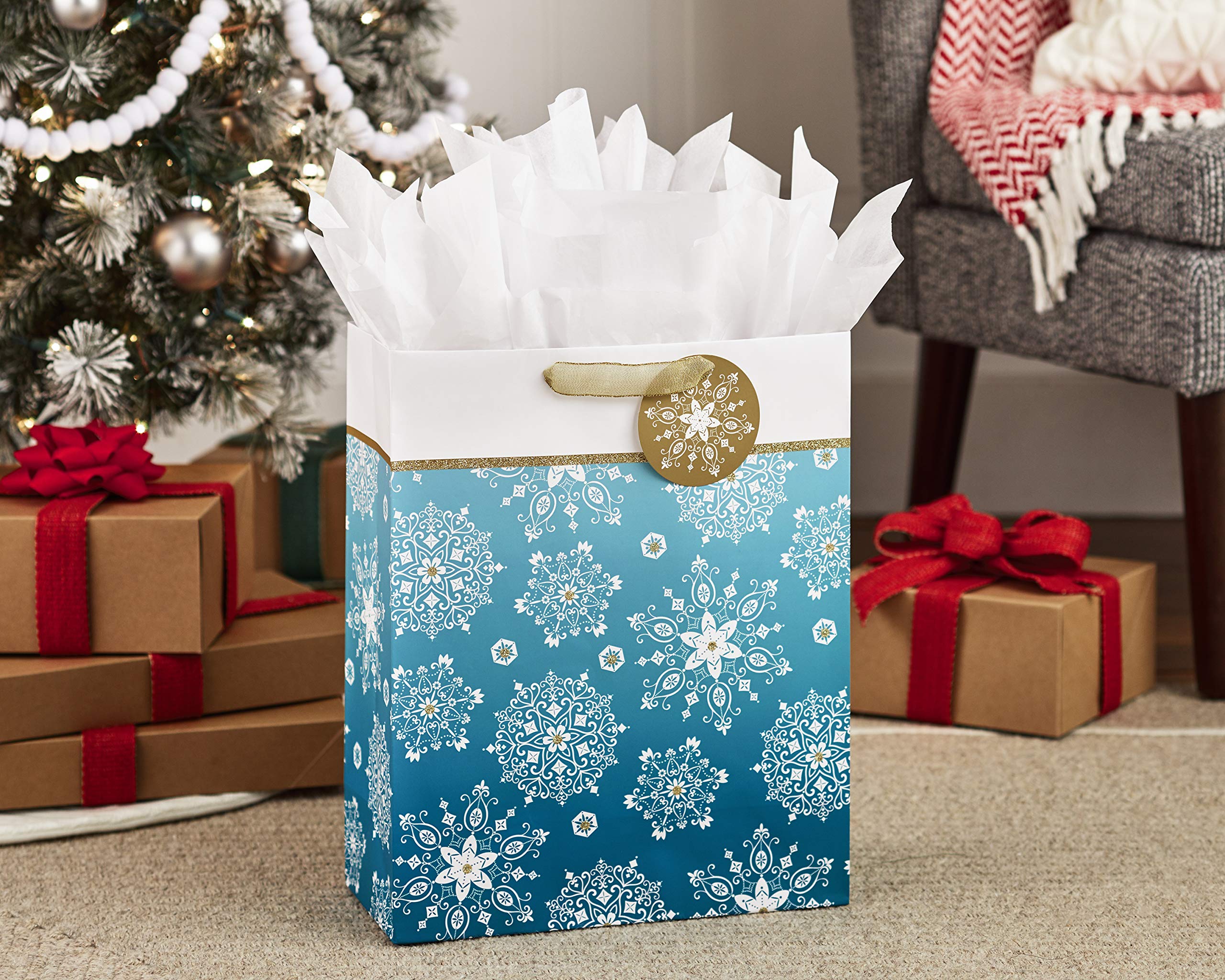 Designed with shimmering snowflakes, a gold gift tag, and sheer gold ribbon handle, this extra large gift bag is a festive way to wish someone a happy holiday. All-in-one gift bag and tissue paper set makes wrapping holiday presents quick and easy, and this package is sure to look perfect under the tree or at any winter gathering. The Hallmark brand is widely recognized as the very best for greeting cards, gift wrap, and more. For more than 100 years, Hallmark has been helping its customers make everyday moments more beautiful and celebrations more joyful.