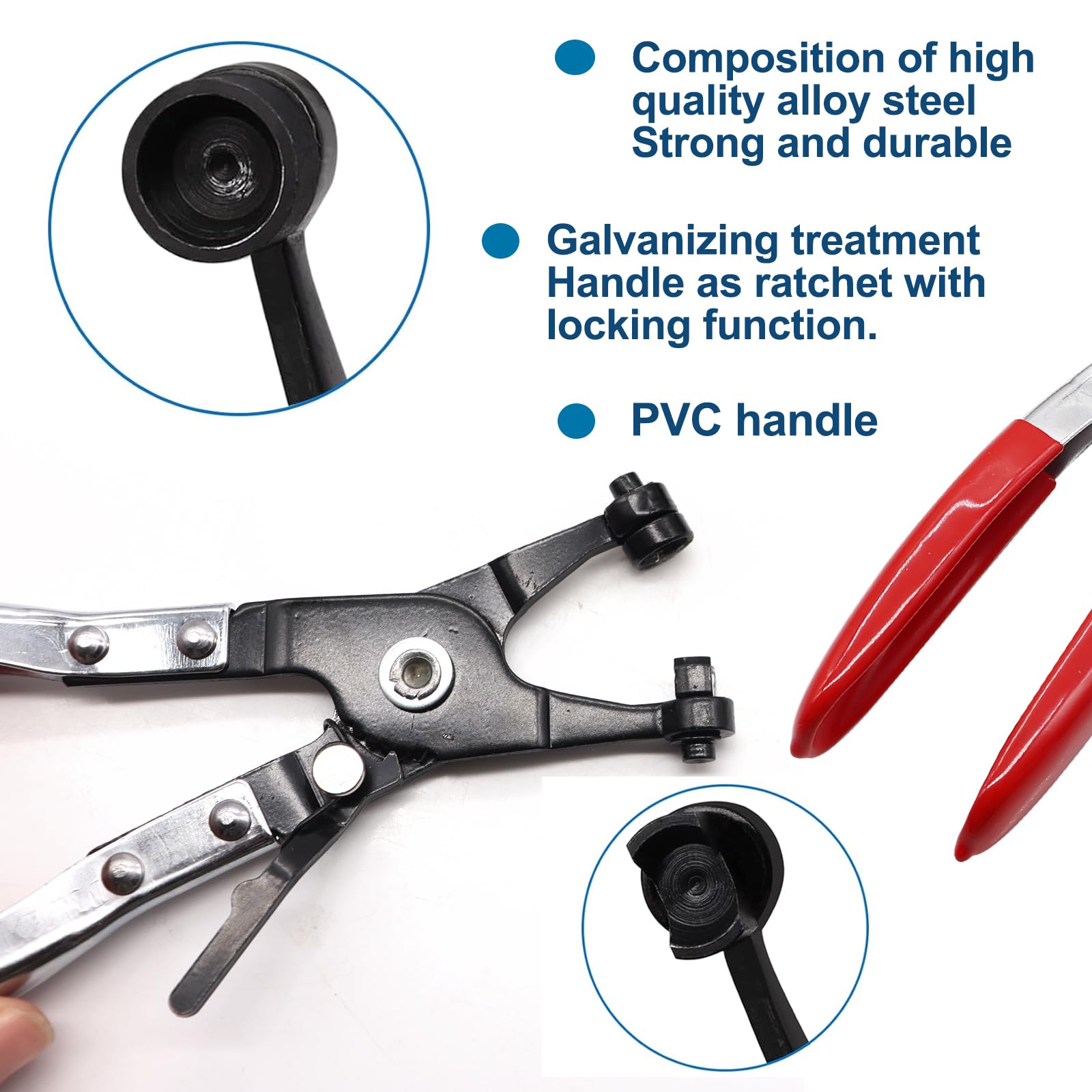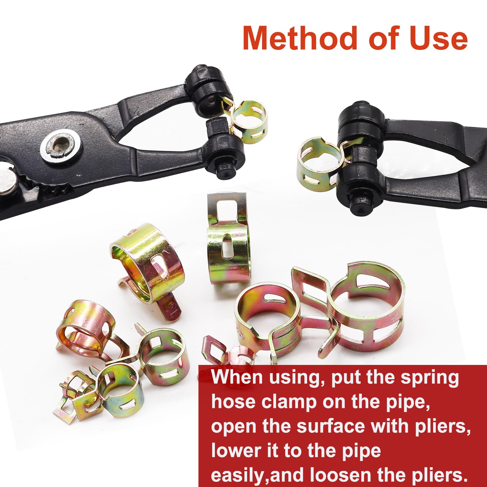 Usage:When using,put the spring hose clamp on the pipe,open the surface with pliers,lower it to the pipe easily,and loosen the plier
