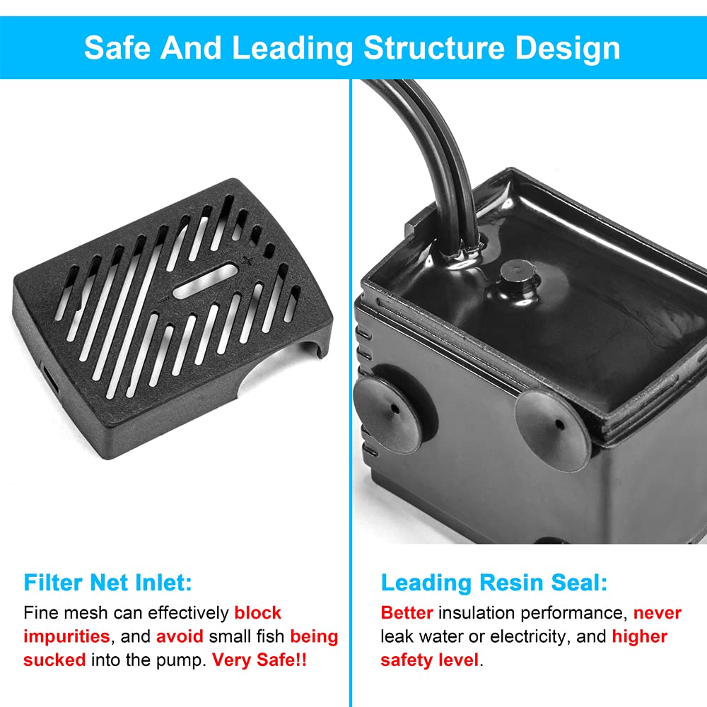 Safe And Leading Structure Design -- Filter net inlet, fine mesh can effectively block impurities, and avoid small fish being sucked into the pump, very safe. Leading resin seal, better insulation performance, no need to worry about water leakage or electric leakage, and higher safety level. From the moment of choosing DaToo, a safe and comfortable water environment is no longer a dream.
