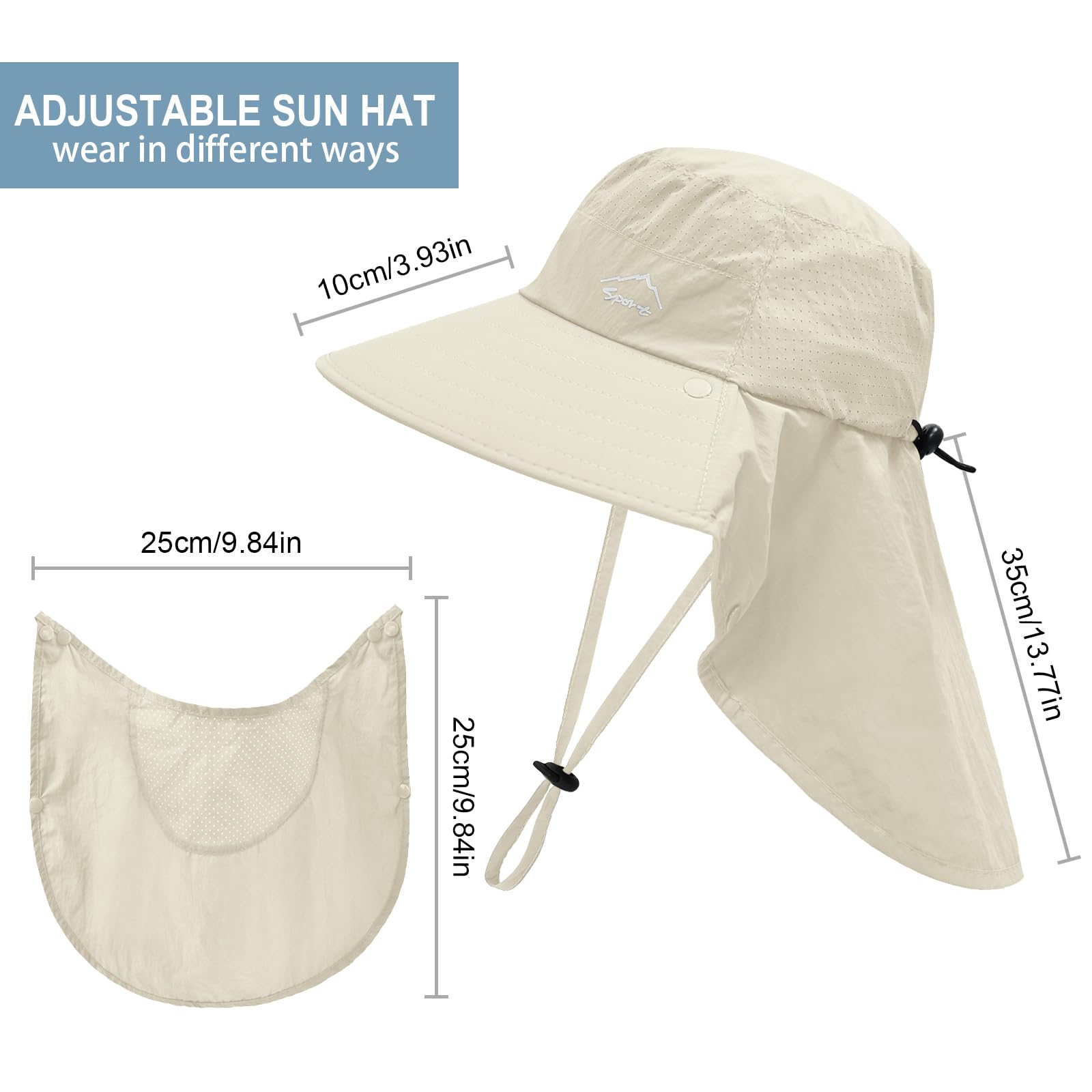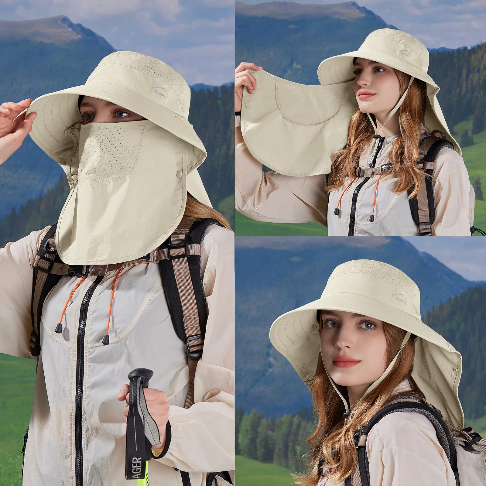 360° PERFECT SUN PROTECTION: This sun hat combined with wide brim, face & neck flap (face flap are removable) Which can keep the sun off your head, face and neck. The hat is rated for 50+ UPF to protect against harmful UVA and UVB rays, offering complete UV protection for your face, ears, and neck.